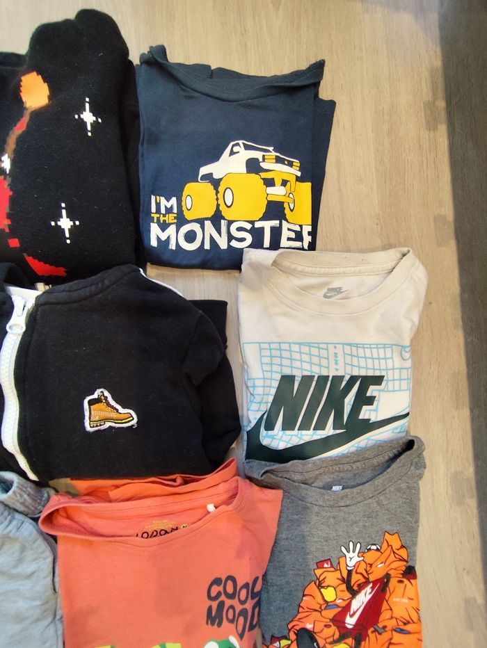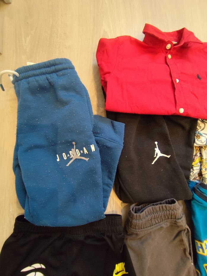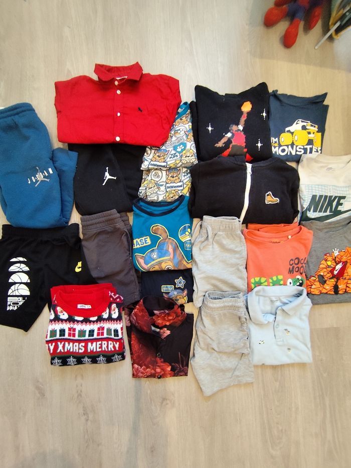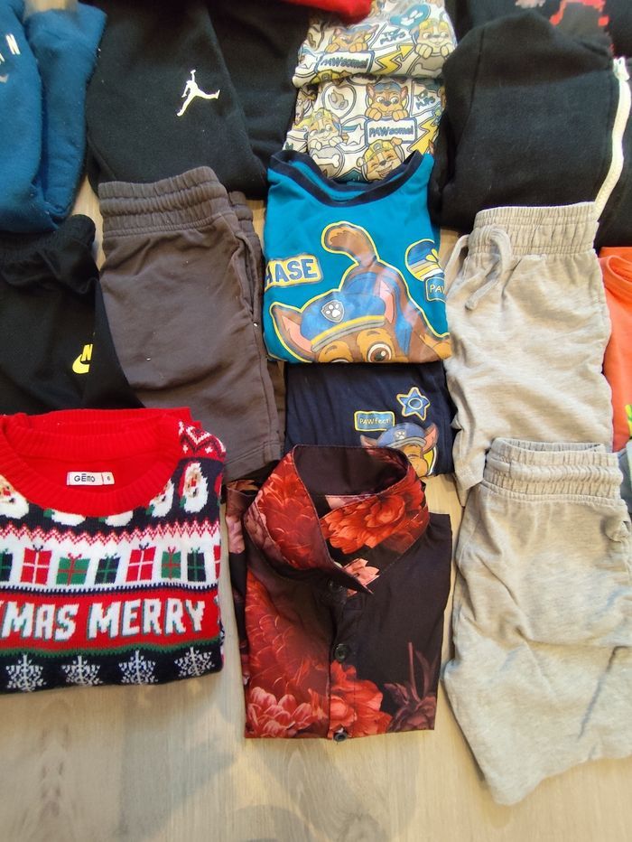 En très bon état. Deux jogging Jordan ( le bleu a quelques défauts ( accro entre jambes et bouloches )),4 short dont un Nike, deux pyjamas manches longues pat patrouille, un sweat capuche Jordan et sweat zippé Timberland,une chemise manches courtes a fleurs, une chemise manches longues rouge portée une seule fois a Noël, un pull de noël porté une seule fois , deux Tshirt Nike, un t-shirt manches courtes un polo manches courtes et un t-shirt manches longues.