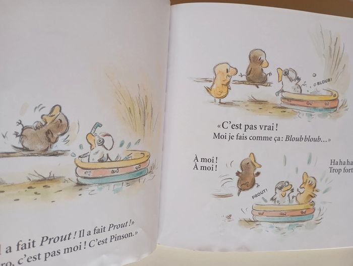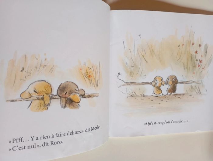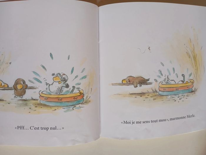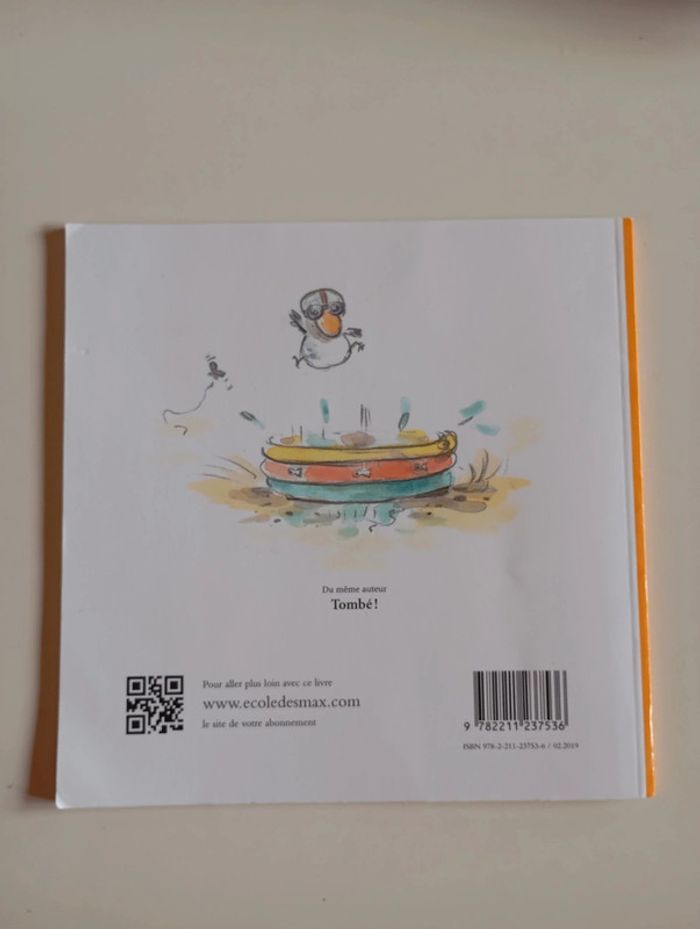 « La tablette, c’est fini pour aujourd’hui ! Allez jouer dehors ! » dit papa. « Pfff… Y a rien à faire dehors », répond Roro. Tout est trop nul, le foot, la balançoire, même jouer à chat perché. Et la piscine ? « C’est trop froid » dit Merle. Pinson, lui, trouve que c’est vraiment cool de jouer dans l’eau ! Très vite, son enthousiasme gagne les autres. Bloub bloub ! Editeur : Ecole des Loisirs 32 pages Dimensions : 22 x 22 cm Âge : 4 - 7 ans Livre en bon état (Traces de manipulation) Je vends d'autres livres de l'Ecole des Loisirs #phil_peg_écoledesloisirs #écoledesloisirs #oiseaux divers #ennui #jeu #informatique #internet