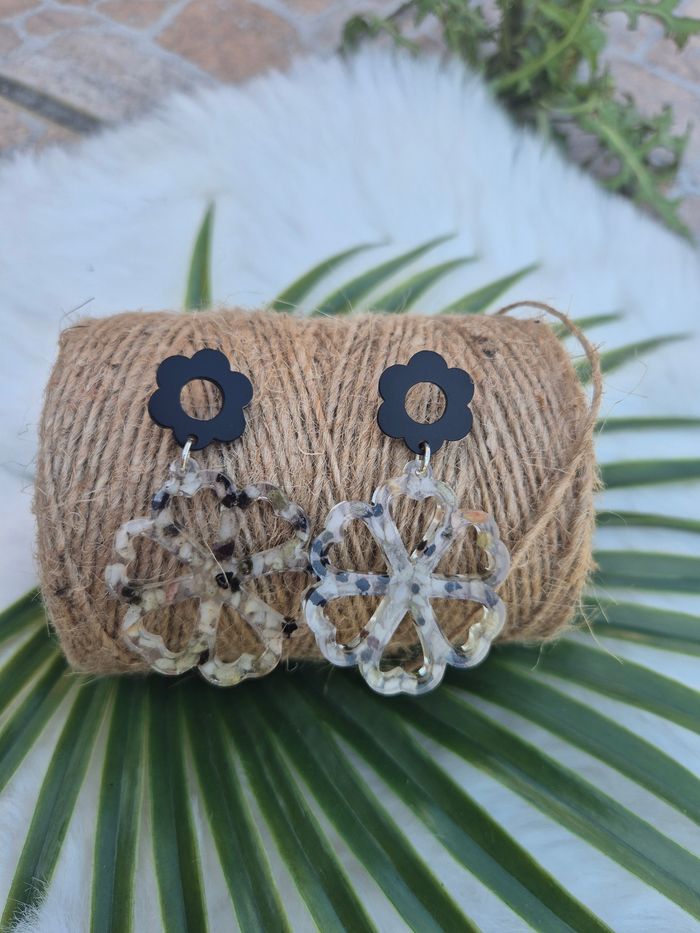 Ces boucles d'oreilles sont une création artisanale unique, combinant résine et éléments naturels. De petits cailloux d'aquarium ajoutent une touche originale et discrète à chaque pièce. Les clous en forme de fleurs, faits en acrylique noir, offrent un contraste élégant et moderne. La finition avec des fermoirs en caoutchouc assure un confort optimal tout au long de la journée. Ces boucles d'oreilles incarnent un mariage subtil entre la nature et le design.
