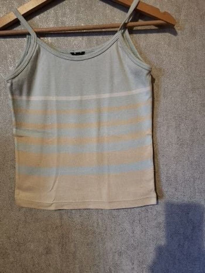 débardeur à rayures bleu et beige et blanc la première dimension est pris de bretelle à bretelle , si on part des aisselles 35 cm
