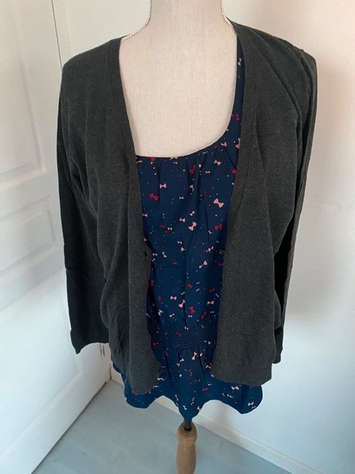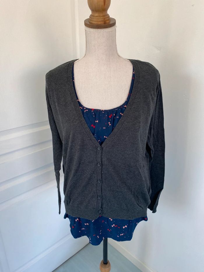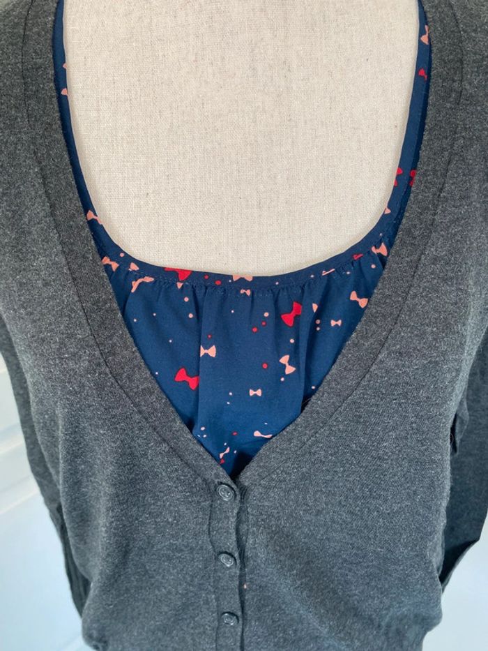 Pull gilet gris effet trompe l’œil avec impression d’une chemise en dessous ( bleu marine avec motif noeuds) Marque kookai Absence d’étiquette de taille et de composition Aisselles 55cm Longueur avec chemise 65cm #caco3007femme