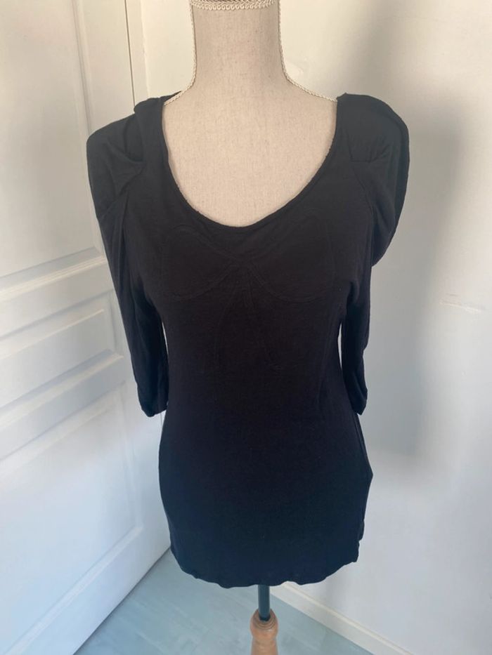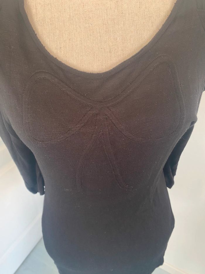 T shirt long noir Manches 3/4 Fronces au niveau des épaules Détail broderie noeud devant Marque Sandro Taille 3 Aisselles 39cm Épaules 39cm Longueur 73cm 100% viscose flamé #caco3007femme