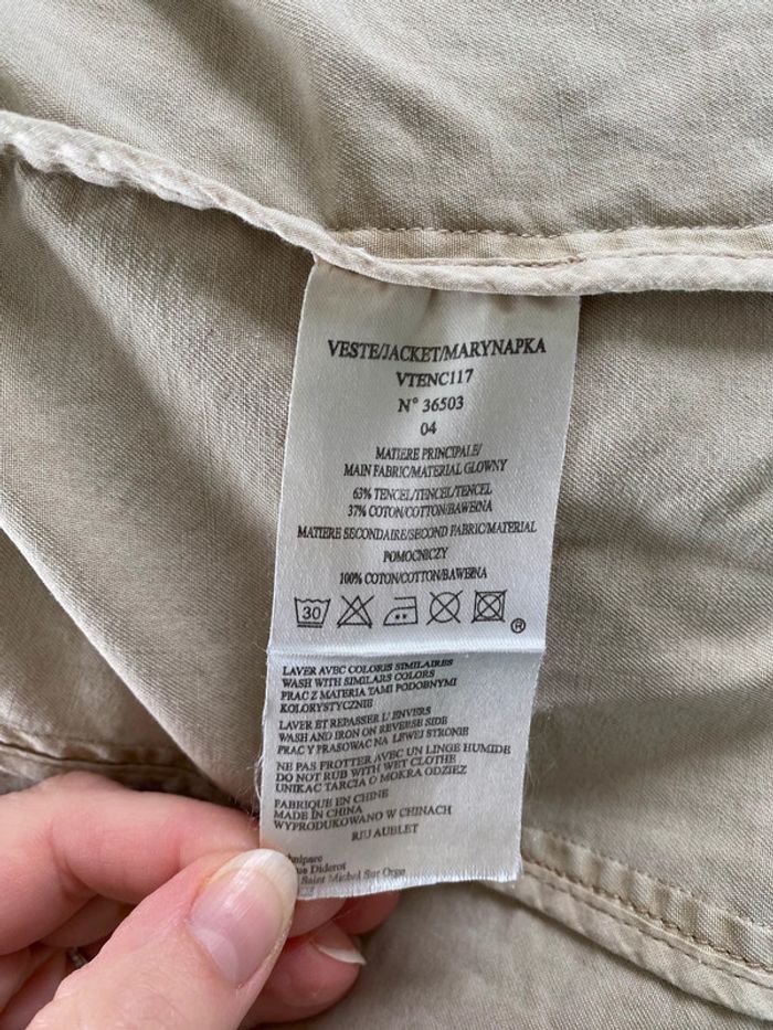 Veste légère beige avec détail de broderie au niveau du col , des poches et des poignets Matière tencel et coton Épaules 45cm Aisselles 52cm Longueur 58cm #caco3007femme