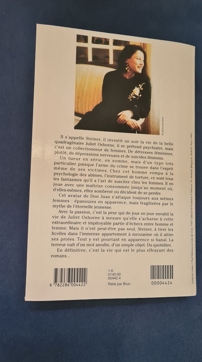 L'homme fatal Autrice : Irène Frain Le Grand Livre du Mois Roman Il s'appelle Steiner. Il se dit psychiatre. Lorsque Juliet Osborne, la quarantaine indépendante, le voit entrer dans sa vie, elle est aussitôt partagée entre l'attirance et la peur. Elle découvrira peu à peu que Steiner n'est pas seulement un don juan, un collectionneur de femmes. Expert à jouer des fantasmes féminins, il choisit des victimes en apparence épanouies, mais fragilisées par le mythe de l'éternelle jeunesse. Et c'est ainsi qu'il les mène savamment, méthodiquement, vers leur perte. La romancière du Nabab et de Secrets de famille campe ici un " tueur en série " d'un genre nouveau. Et, passant subtilement de la psychologie au suspense, rivalise avec les grandes dames anglo-saxonnes du crime. Livre broché. Dim : 15.5 x 24 cm Très bon état (cf. photos) Lors de la lecture utilisation de marque-page. Pas de page cornée, ni d'annotations. #roman #suspens #psychologie #thriller #legrandlivredumois #irenefrain #lhommefatal #mar-taylivre