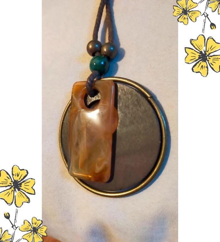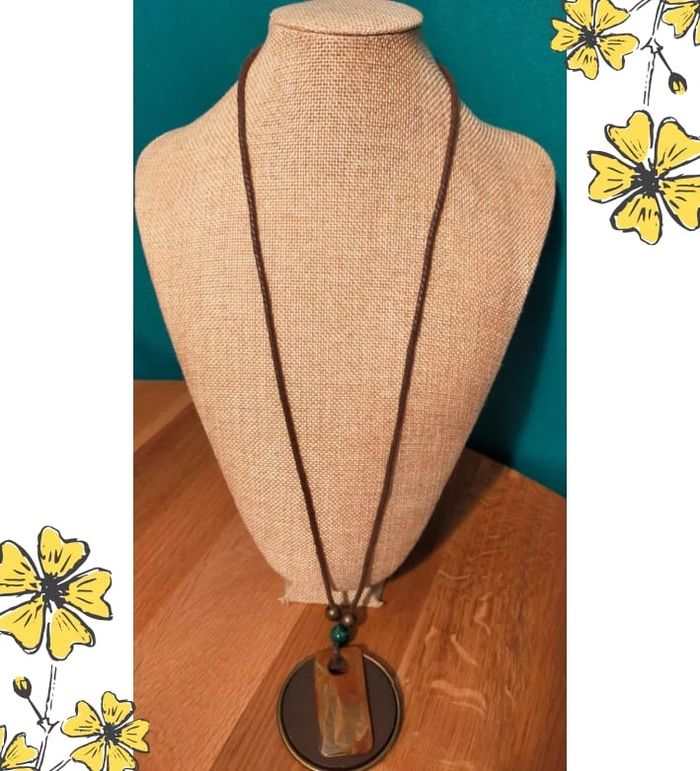 Collier long au style artisanal et naturel, composé de : Cordon textile marron tressé Grand médaillon rond en bois foncé cerclé de métal doré vieilli Pendentif rectangulaire en résine marbrée (teintes caramel et ivoire) Perles fantaisie métalliques bronze et perle effet malachite verte Un bijou léger et original, idéal pour accessoiriser un look bohème, casual ou estival. 💬 Détails : • Matières : Bois, résine, métal doré vieilli, corde textile, perle fantaisie • État : Très bon état • Couleurs : Marron, caramel, vert, bronze 🎀 Collection : Terres d’Ailleurs 💌 Je soigne l’envoi & l’emballage. Envoi rapide. 🎁 Possibilité d’envoi en lot ou d’ajouter un petit cadeau surprise en cas de plusieurs achats ! L8R #collier #bijouxfemme #boheme #ethnique #bijouxnaturels #terresdailleurs #bois #resine #accessoires #vintage