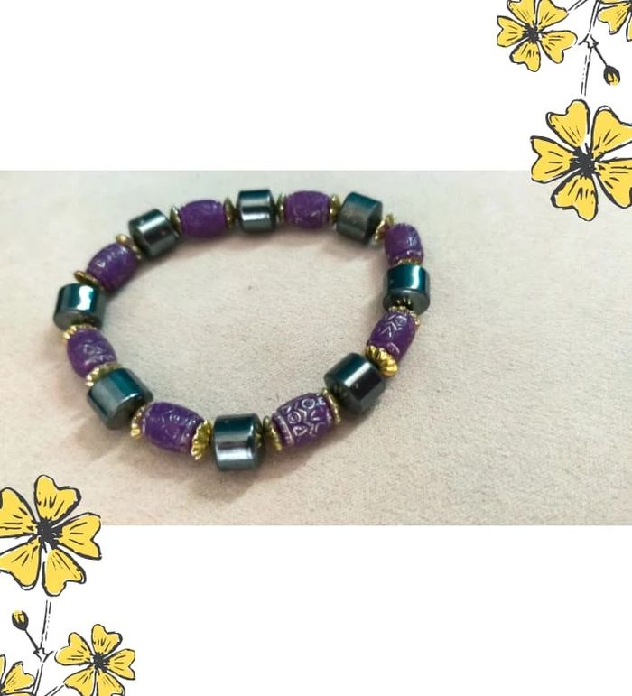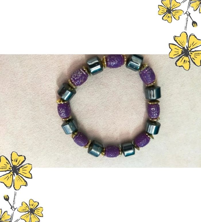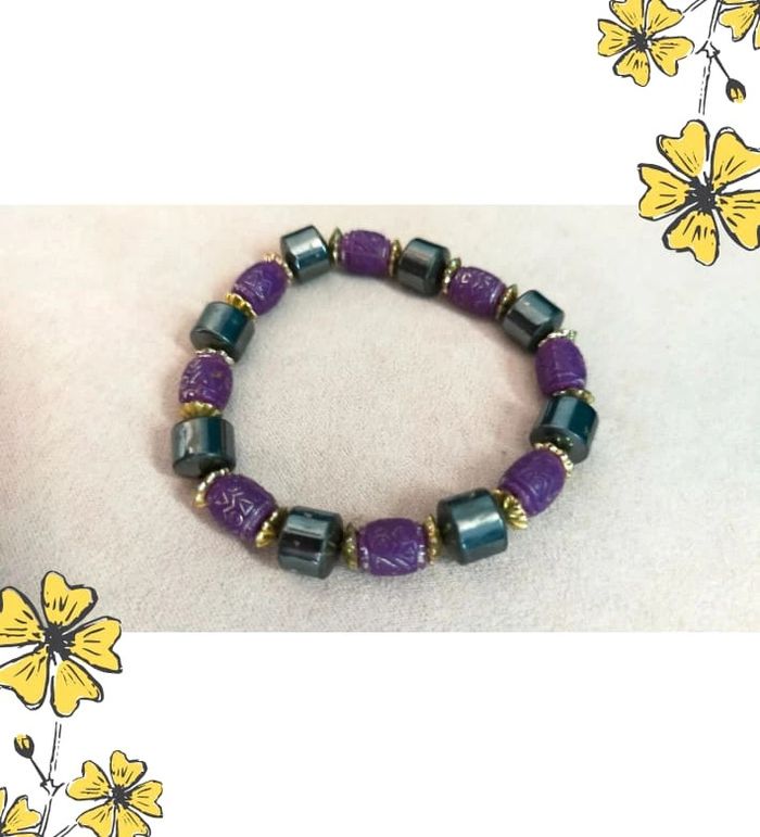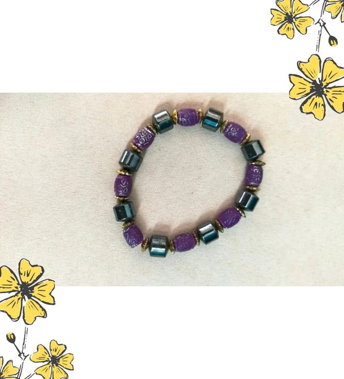 Bracelet élastiqué composé de perles violettes finement sculptées façon céramique ou résine, alternées avec des perles cylindriques effet hématite métallisé, rehaussées de petites entretoises dorées. 🖐️ Probablement fait main, belle harmonie de matières et de couleurs. La finition et les motifs des perles évoquent un style ethnique vintage ou artisanal. 🔄 Modèle unique, confortable à porter grâce à son montage sur élastique. 📏 Tour de poignet : environ 17 cm (élastique extensible) 📦 Envoi rapide et soigné 🎁 Possibilité d’envoi en lot ou d’ajouter un petit cadeau surprise en cas de plusieurs achats ! L7V #bracelet #braceletvintage #bijouxfantaisie #braceletviolet #braceletethnique #braceletelastique #bijouartisanal #collectionrefletsdelavande #bijouxvinted #braceletoriginal #faitmain