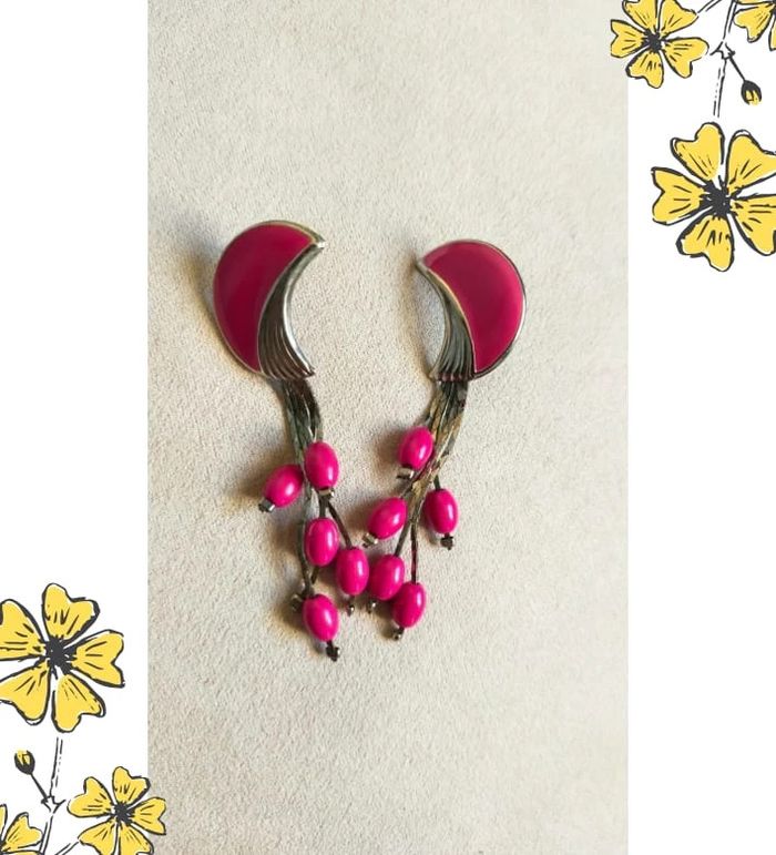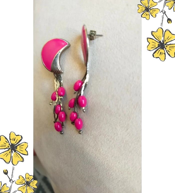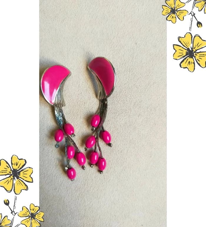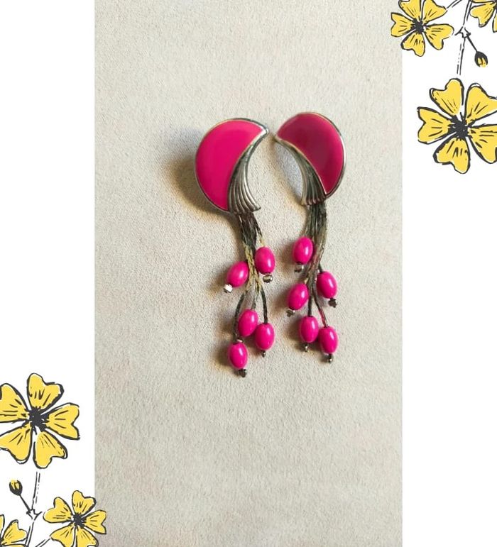 Très jolies boucles d'oreilles fantaisie vintage, originales et pleines de peps ! Monture en métal argenté avec attache à vis, forme demi-lune émaillée rose fuchsia sur le lobe, et pendants façon petites baies en perles ovales assorties. Un style à la fois rétro et floral, parfait pour apporter une touche de couleur à vos tenues ! 💌 Je soigne l’envoi & l’emballage. Envoi rapide. 🎁 Possibilité d’envoi en lot ou d’ajouter un petit bijou surprise en cas de plusieurs achats ! État : Très bon état #bouclesdoreilles #bouclespendantes #bijouxfantaisie #vintage #rosefuchsia #bijouoriginal #stylevintage #bohème #bijouxrétro #bijouxcolorés #bijouxfemme #bijouxunique #bijouxfleur