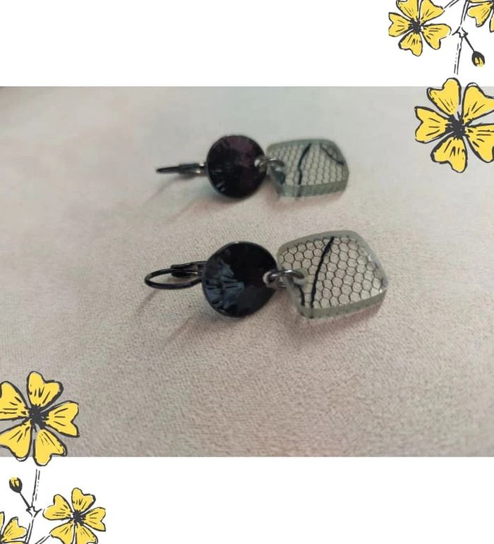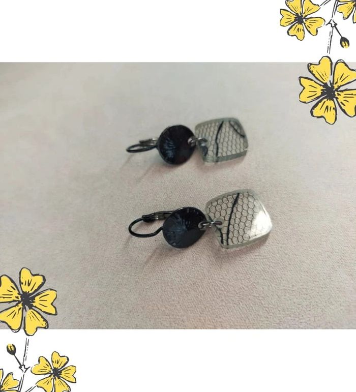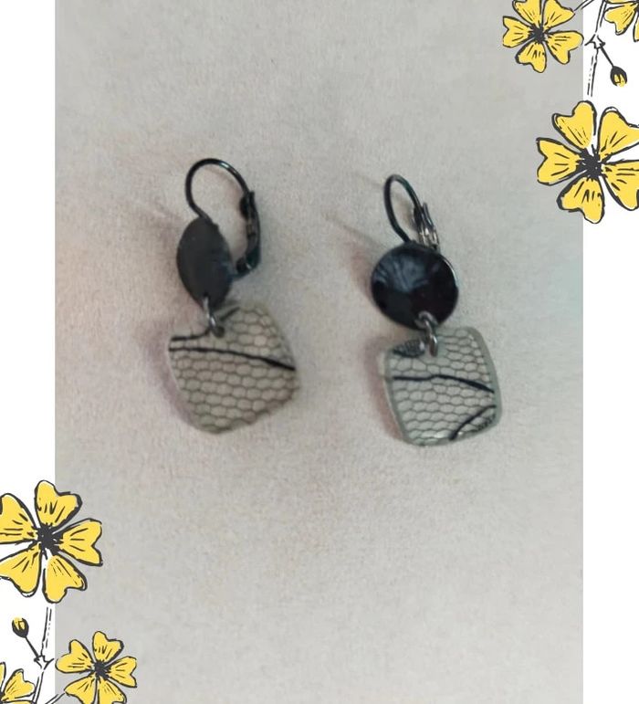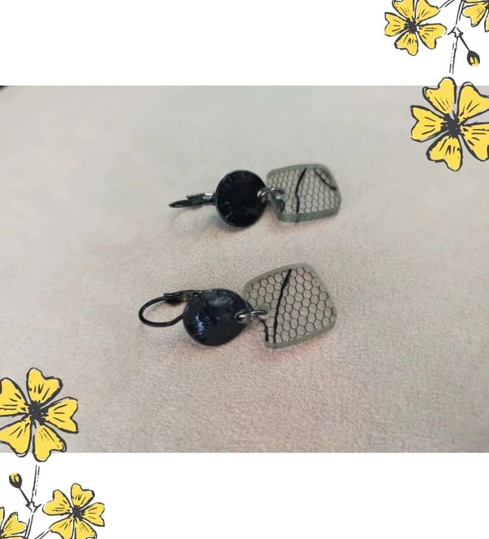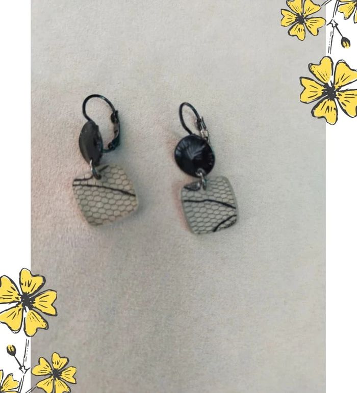 Paire de boucles d’oreilles très originales, composées d’un médaillon rond noir brillant et d’un pendentif carré bombé à motif nid d’abeille sur fond beige, avec un subtil fil noir décoratif. Les attaches sont à levier, pratiques à enfiler et sécurisées. 🔸 Matières estimées : résine pour les deux éléments, attache en métal noir 🔸 Style : moderne, graphique, légèrement ethnique 🔸 Attaches : à levier (fermeture sécurisée) 🔸 État : très bon état, nettoyées 🔸 Collection : Sable & Ébène 💌 Envoi rapide & soigné 🎁 Possibilité d’envoi en lot ou d’ajouter un petit cadeau surprise en cas de plusieurs achats ! #bijoux #bouclesdoreilles #graphique #résine #noirbeige #ethnique #original #faitmain #collection #sableetebene #accessoirefemme