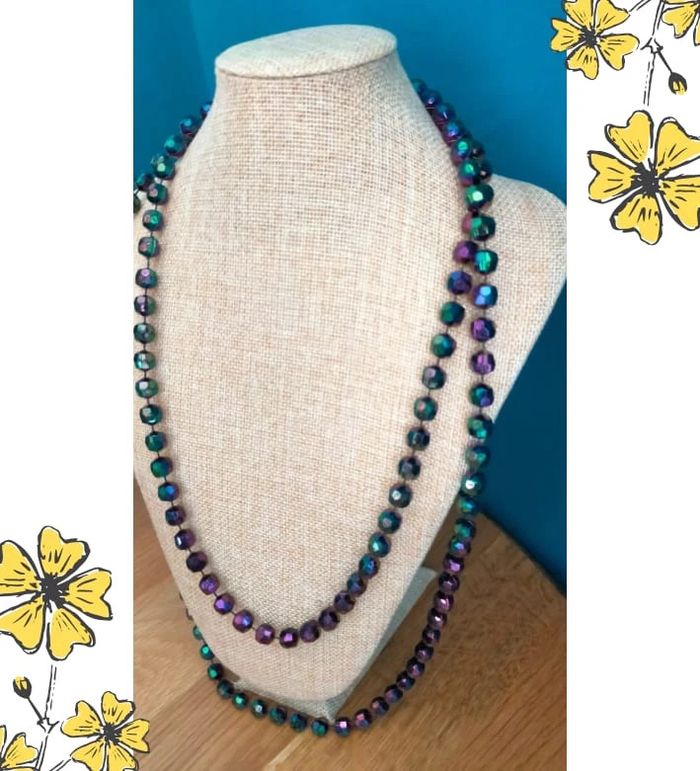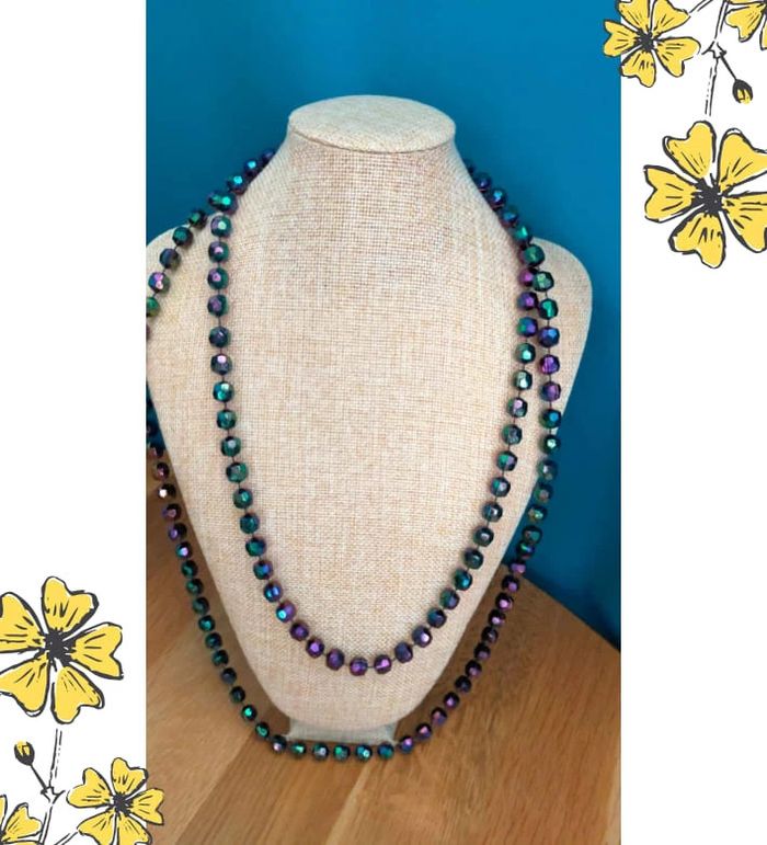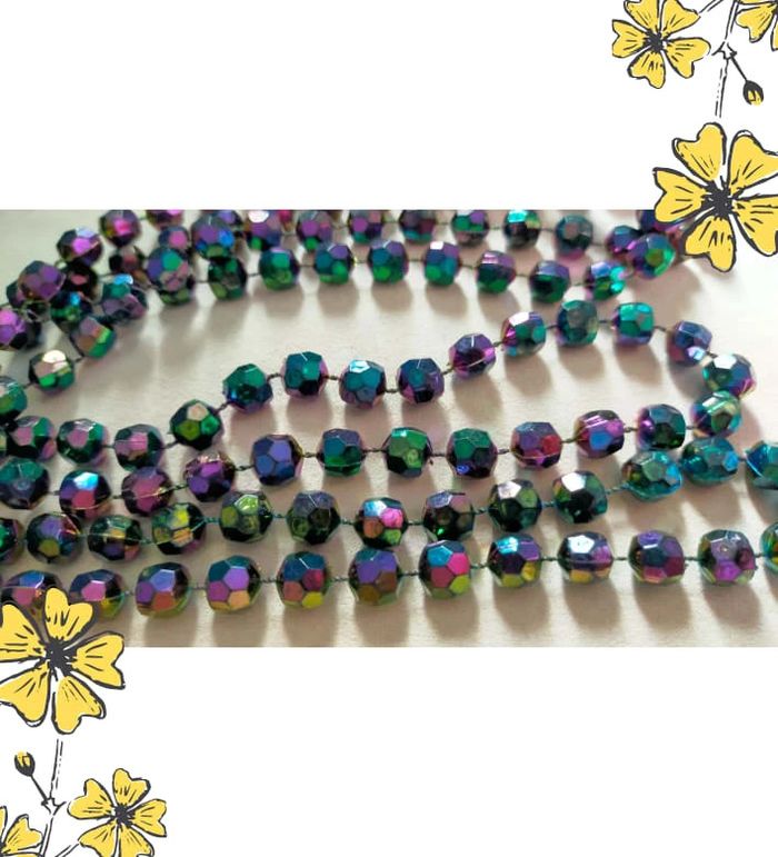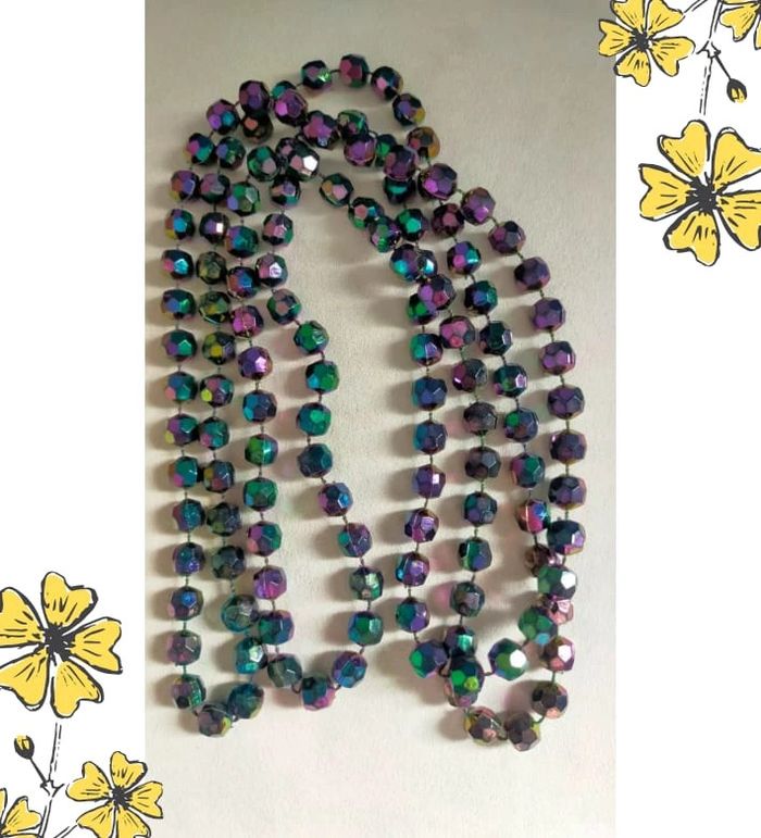 Élégant collier vintage composé de perles facettées aux reflets multicolores (dominantes violet, vert et bleu), pour un effet lumineux et changeant selon la lumière. 💜 Look rétro et raffiné, à porter en simple ou double rang selon l'effet désiré. 🔗 Collier sans fermoir, à enfiler directement. 🎀 Pièce vintage en très bon état général. 💡 Idéal pour accessoiriser une tenue de soirée, un look rétro ou ajouter une touche originale à une tenue sobre. 📏 Longueur : environ 112 cm 📦 Envoi soigné et rapide 🎁 Possibilité d’envoi en lot ou petit cadeau surprise pour les commandes multiples ! L7V #colliervintage #perlesirisées #bijouxvintage #collierlong #accessoirevintage #collectionlavande #colliermulticolore #bijouxfantaisie #bijouretro #jewelrylover #lavandevibes #vintagestyle #vintagetreasure #cadeauoriginal