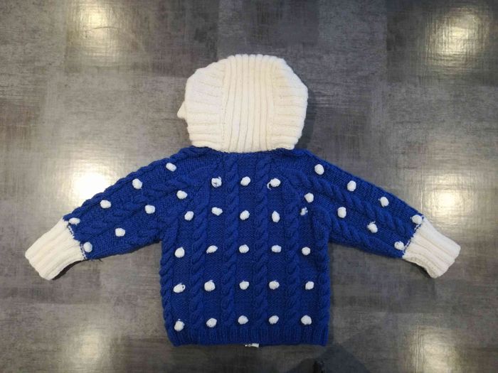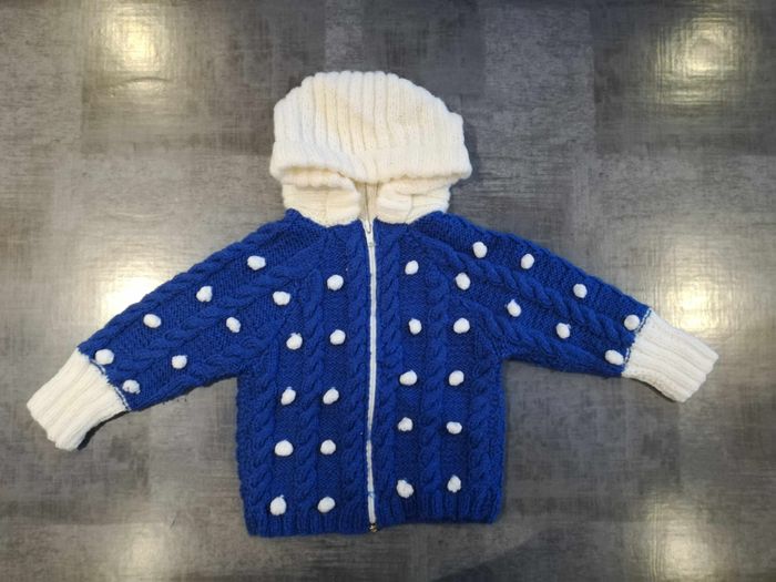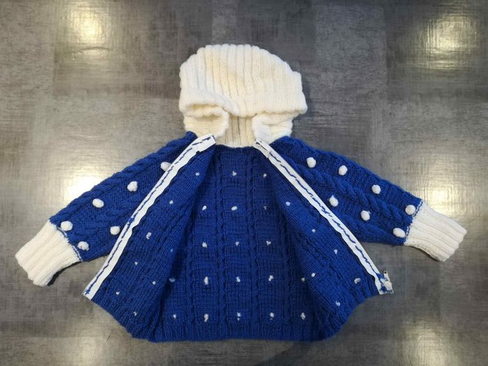 Gilet bébé zippé bleu marine et blanc, tricoté main. Taille 3 mois