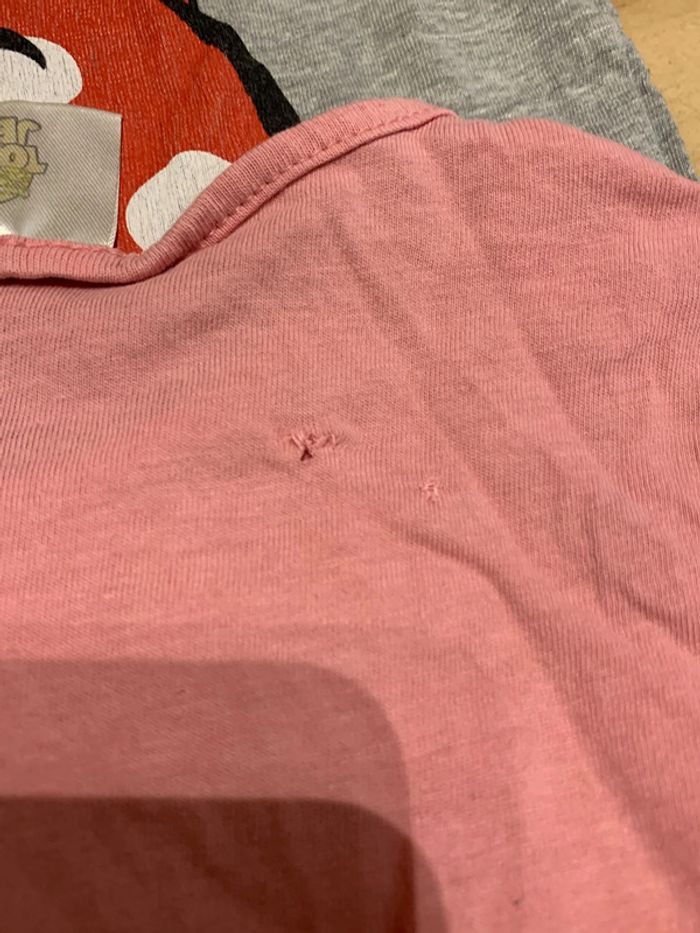 🌟 Le Tom et Jerry de Sun City en 3 ans est rose avec le dessin de Jerry et le mot smile. Il est en bon état une petite tache en bas du dos mais qui je pense par au lavage et un rapiècement sur l’arrière droite (je l’ai eu comme sa) mais rien de gênant. 🌟 Le Disney Minnie est de couleur gris avec pour motif le noeud de Minnie rouge à pois blanc et l’inscription en noir Little Mousse. Il est en très bon état sauf au niveau du noeud où il est légèrement craquelé. Tous les défauts sont en photo ainsi que la matière. Si elle n’y sont pas c’est qu’il n’y en a pas ! 🌸 Pas de tache 🙂 🌺 N’hésitez à fouiller, réduction sur les lots activée 😊 ✉️ Envoie rapide 😉 Si vous avez des questions n’hésitez pas à m’écrire je mets régulièrement des articles alors pensez à vous abonner pour ne rien manquer 🙂 😉