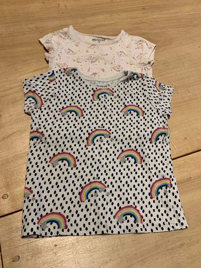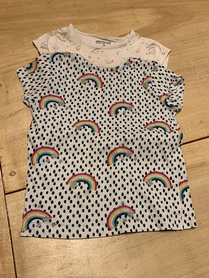 Lot de 2 tee-shirts blanc avec motifs arc en ciel et licorne 3 ans en très bon état - photo numéro 1