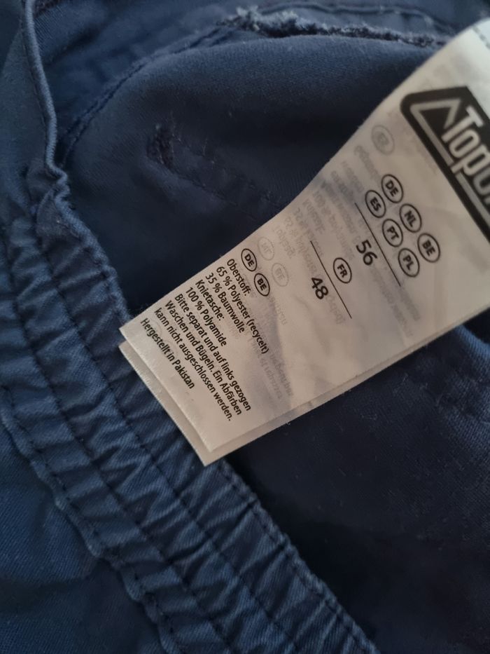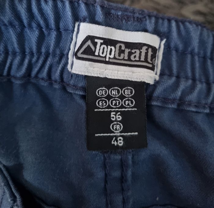 Pantalon de travail bleu, multiples poches (12 au total) ,taille 48 marque TopCraft,fermeture zippée avec bouton, élastique à la taille, longueur 108cm,largeur de la taille 50cm jusqu'à 53cm ,largeur cuisse 33cm, largeur cheville 21cm, comme neuf porté 1-2fois.
