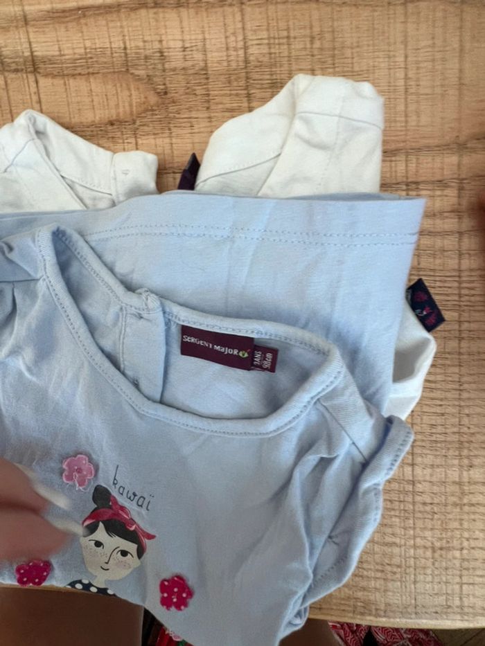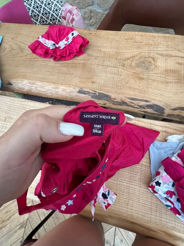 Lot sergent major fille Le tour convient à du 3 ans - robe bleu turquoise Tbe 3 ans - gilet assorti 3 ans Tbe - une robe petit 4 ans dos nu - chapeau de soleil assorti 6-8 ans qui taille minuscule pas plus que 3 ans - gilet rose 2 ans bon état - jupe 3 ans Tbe - t-shirt Lila Tbe - t-shirt blanc 3 ans Be - combinaison pantalon 2 ans grande Tbe - cardigan 3 ans Tbe - bandeau Tbe - trench 3 ans Tbe 27€ le tout , même pas le prix d’une robe !! Soit 12 articles à 2€25 pièce Dernier prix
