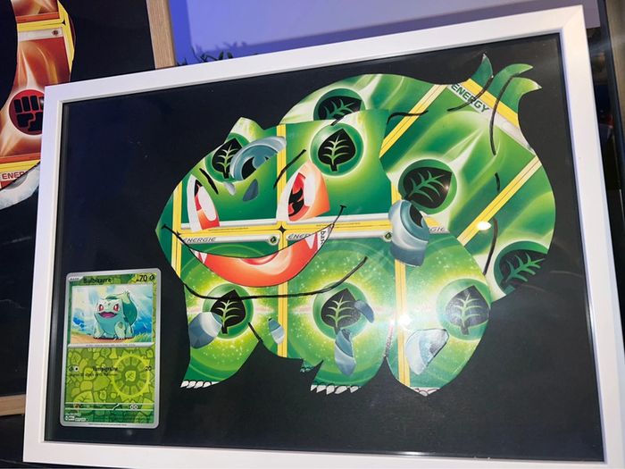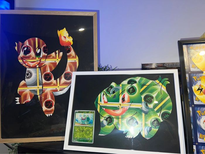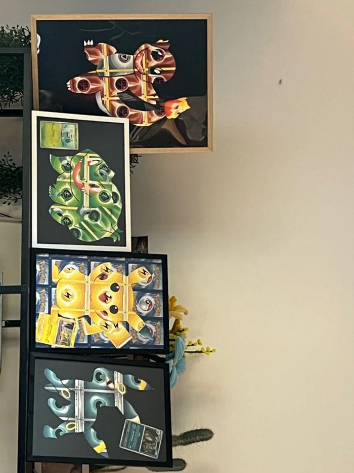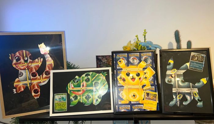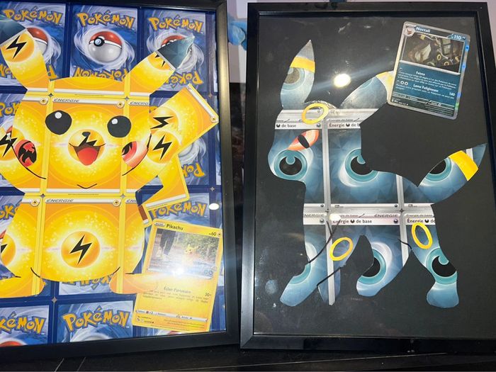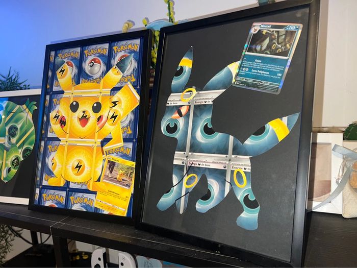 Cadre Pokémon go fait main avec de véritables cartes énergies format a4 pour pikachu , bulbizarre et noctali 10€ a3 12€ pour salameche À poser ou à accrocher au mur au choix pour les a4 , à accrocher ou poser contre quelque chose pour salameche Avec carte Pokémon go pour pika , évolution prismatique holo pour noctali , et 151 reverse pour bulbizarre elles sont incluses authentiques et non collées Carapuce, ectoplasma , coiffeton disponibles également Idéal décoration de chambre enfant , salle gamer … Évolution prismatique , flammes obsidiennes , aventure ensemble , 151 , couronne stellaire … Papier peint / stickers / Fait main / DIY