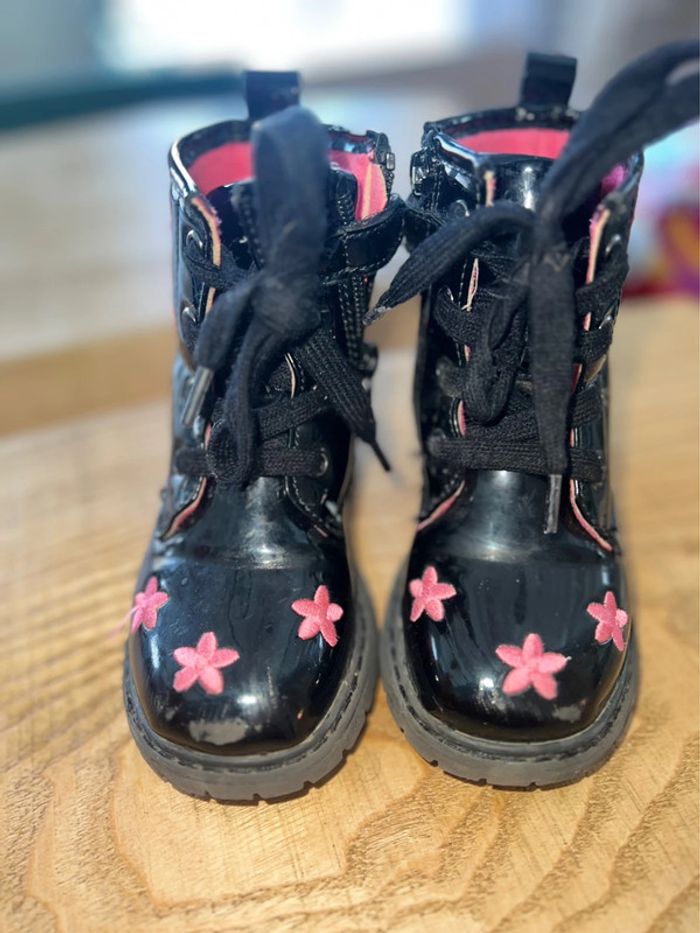 Bottines Rangers NOIR Fille motif Fleuri Fermeture éclair Noir vernies et fleurs rose 🌸 NINI & GIRLS de chez Chaussea Je peux porter mes petites affaires sur le dos que je vais masquer avec du vernis noir, ça sera très peu visible