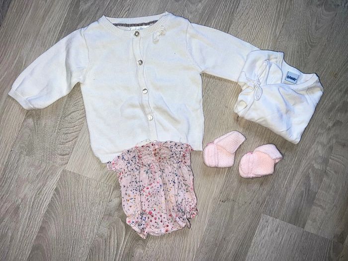 Ensemble en très bon état Gilet kiabi 1 mois blanc Culotte Bloomer Zara 1-3 mois Chaussons fait laine neuf jamais portés 0-3 mois Bodie blanc croisé 0-1 mois