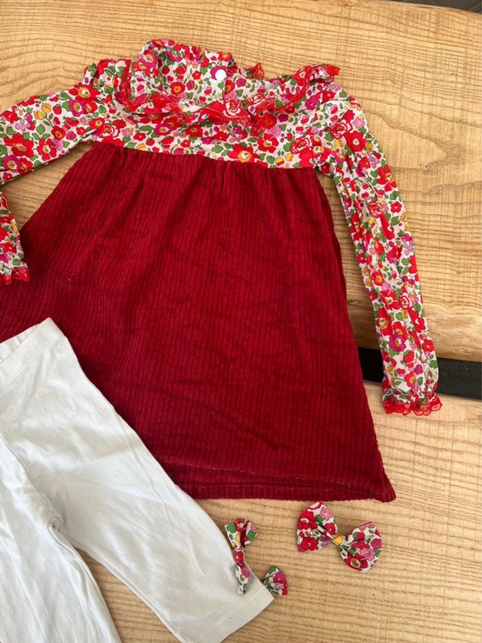 Ensemble fait par une créatrice Robe, legging + pince à cheveux 2-3 ans En très bon état Mateuere coton velours dentelle Col Claudine Liberty of london betsy utilisé également par jacadi