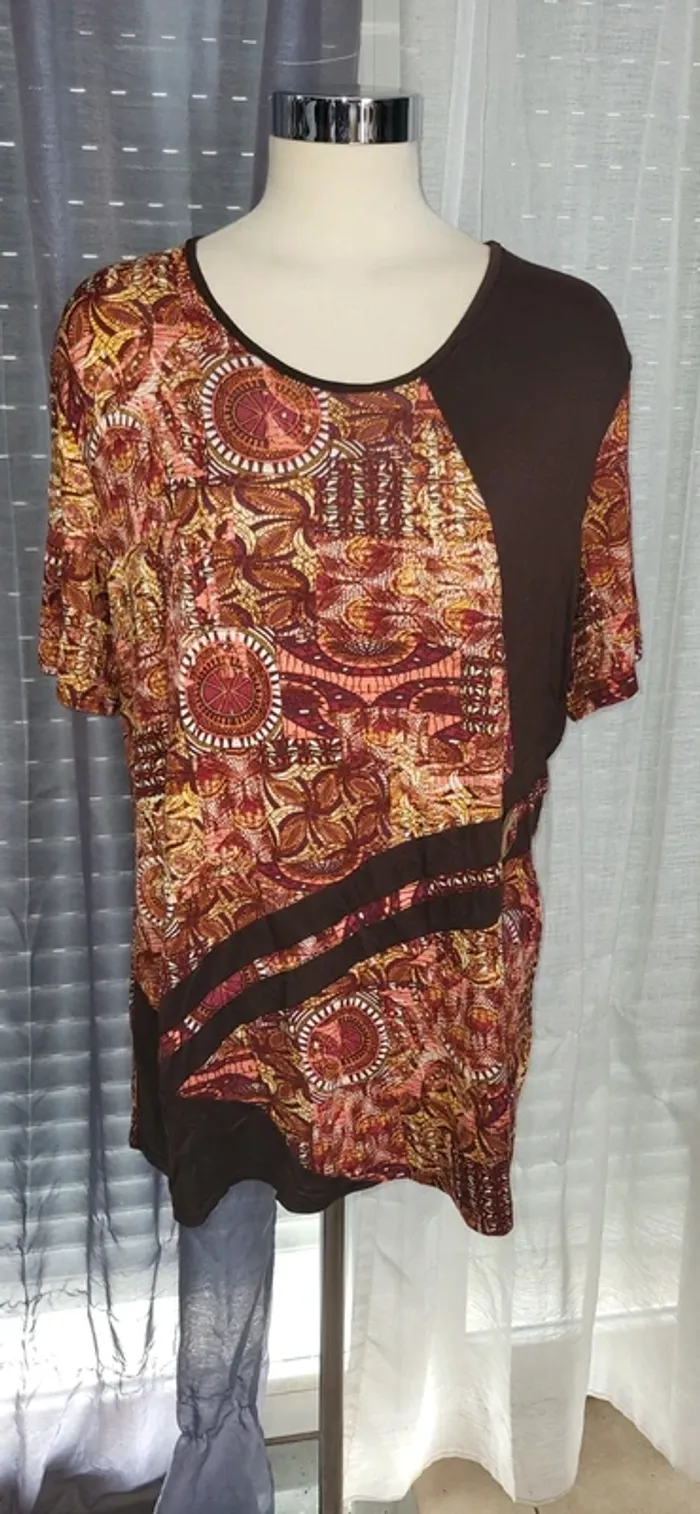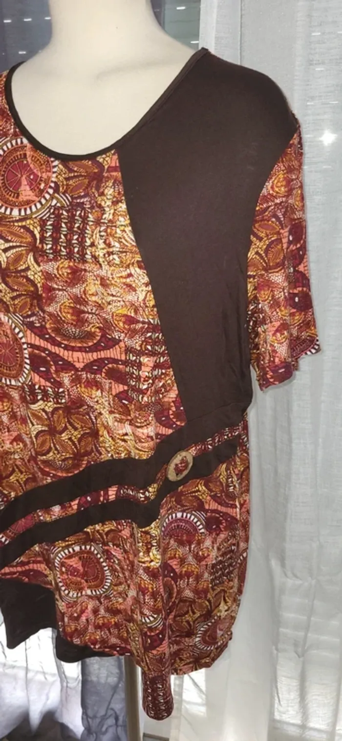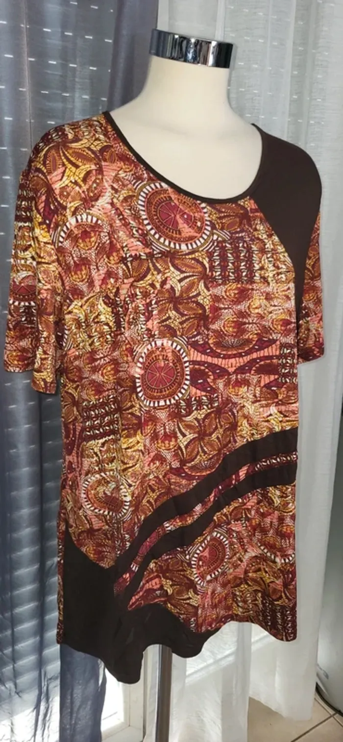 Haut unique mêlant tissu marron uni et imprimé coloré aux tons chauds (rouge, orange, jaune). Le motif circulaire apporte une touche ethnique et artistique. Parfait pour un look bohème ou original ! ✨ Détails : - Taille : 50/52 - Motif : Imprimé circulaire multicolore - Matière : légère À associer avec un jean, un pantalon fluide ou une jupe longue pour un style affirmé