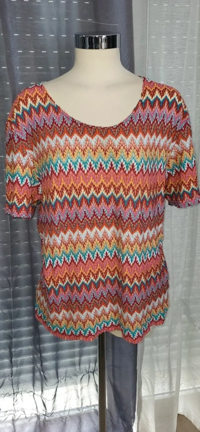 Haut à manches courtes avec un motif zigzag vibrant et multicolore (rouge, orange, jaune, bleu, vert). Très original et plein de peps, il est idéal pour l’été ou pour ajouter une touche fun à une tenue plus sobre. 🎨 Motif : Zigzag multicolore 👕 Coupe : Droite et confortable 📏 Taille : 42/44 À porter avec un jean, un short ou une jupe unie pour un look stylé et décontracté. Plein d'autres vêtements à petits prix #a2life_taille44 #a2life_taille42