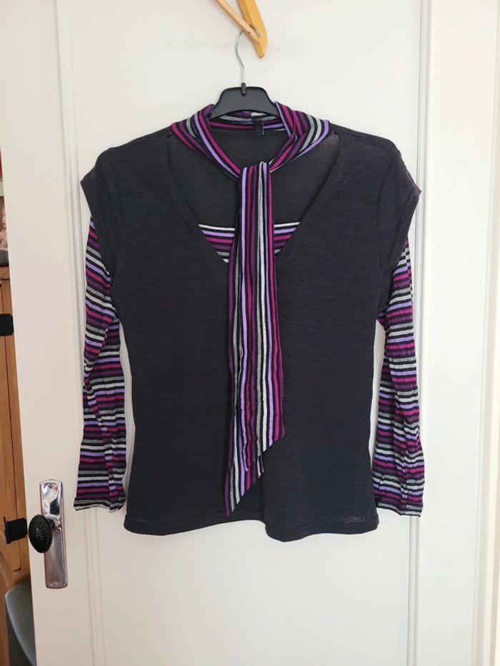 T shirt 2 en 1 uni et manches rayées col foulard taille 3