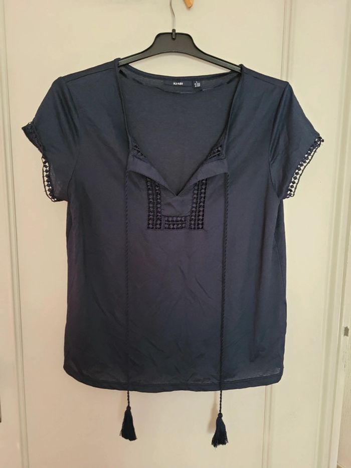 Tunique kiabi jolie dentelle poitrine et manches , col v avec pompons