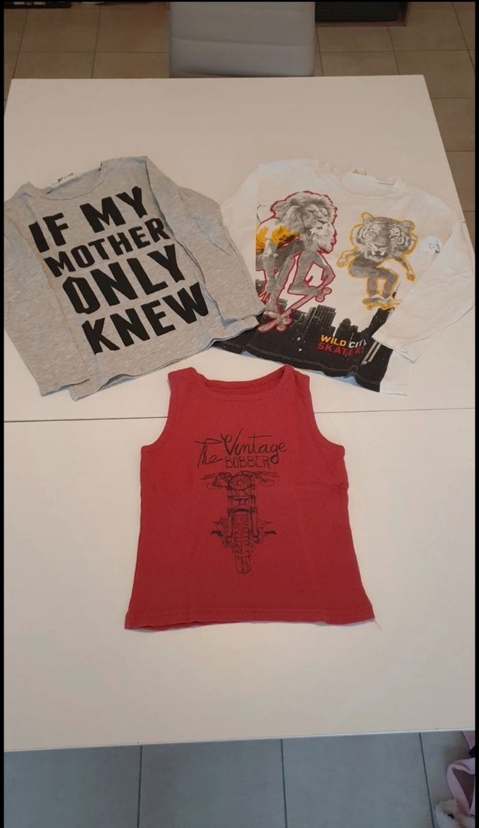 Je vends ce lot de 3 hauts pour enfant de 6 ans, dans des styles et couleurs variés. - Type de produit : Haut - Univers : Enfant - Taille : 6 ans - Couleurs : Multicolore - Caractéristiques : Motifs graphiques, Imprimés 2 t shirts manches longues et 1 débardeur N'hésitez pas à me contacter pour plus d'informations ou de photos