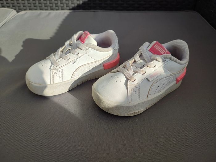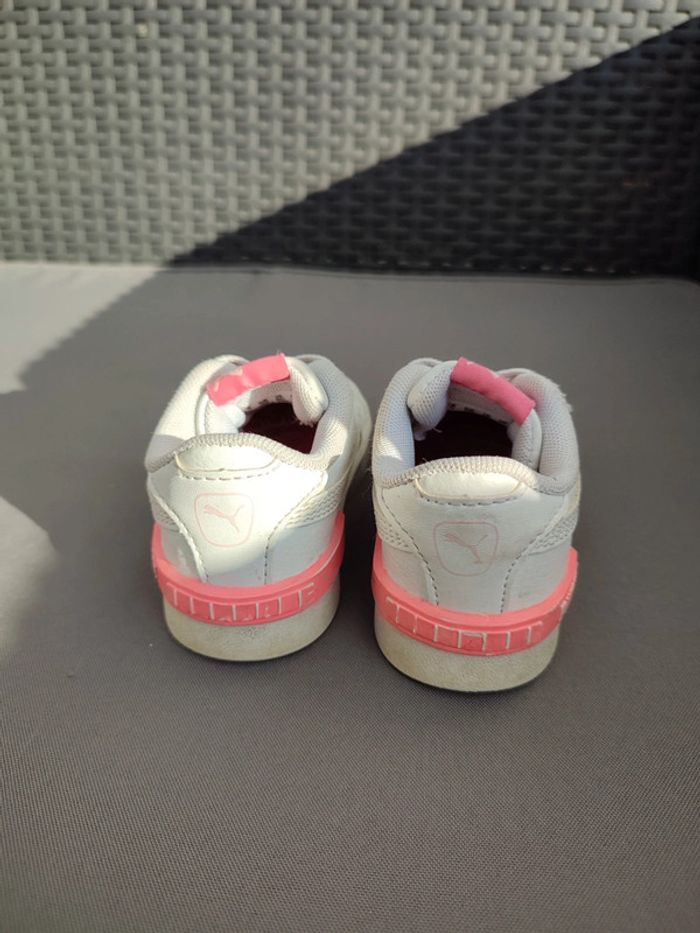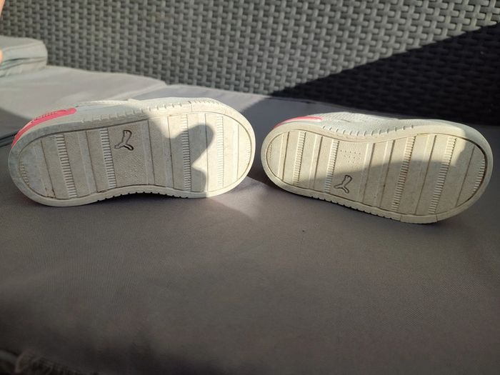 Jolies baskets blanches et roses. Portées une seule saison, elle sont en bon état. Lacets élastiques intégrés : pas besoin de savoir faire ses lacets. Faciles d'entretien. Semelles légèrement compensées pour plus de confort. Baskets authentiques achetées chez Chaussea. Seront lavées pour la vente : machine à laver et produits spécial baskets blanches.