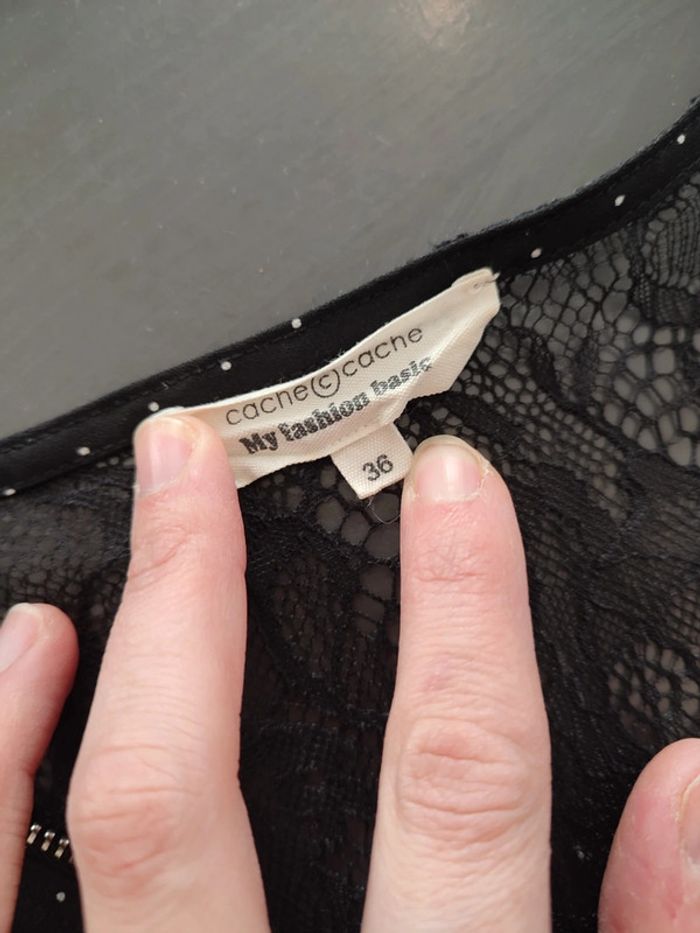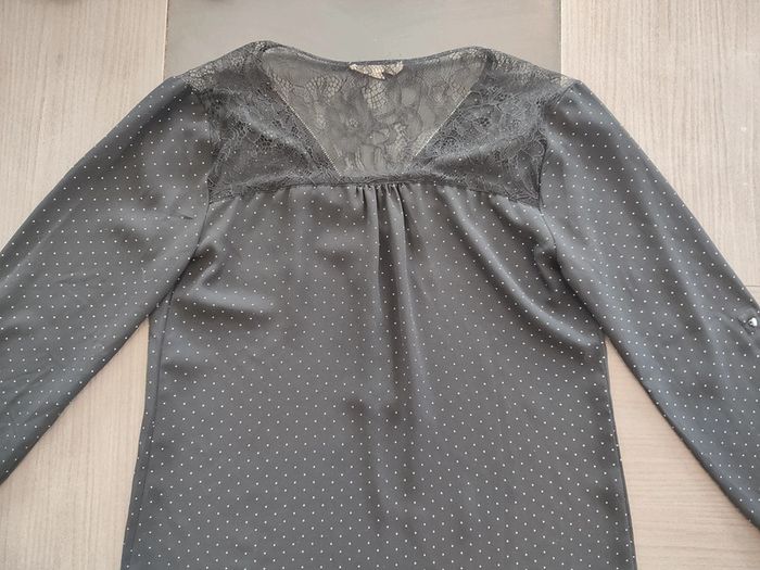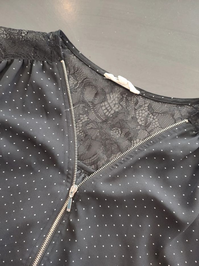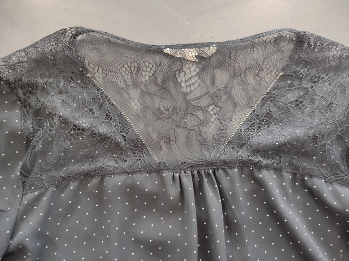 Jolie blouse avec de la dentelle dans le dos. Fermeture argentée devant. Très fluide et légère. Très bon état.