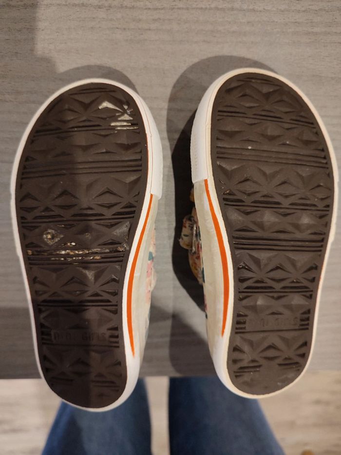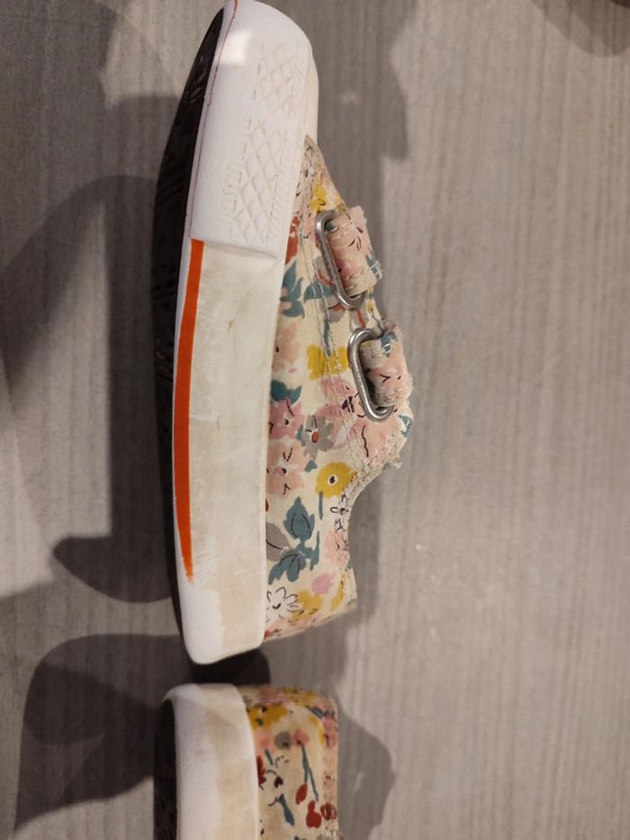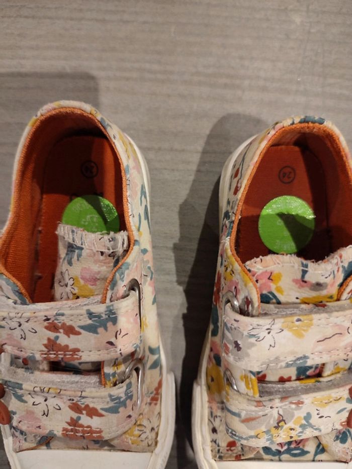 Jolies petites baskets en toile a scratch motif fleurs et papillons. Encore en bon état, elle ont été lavées pour la vente.