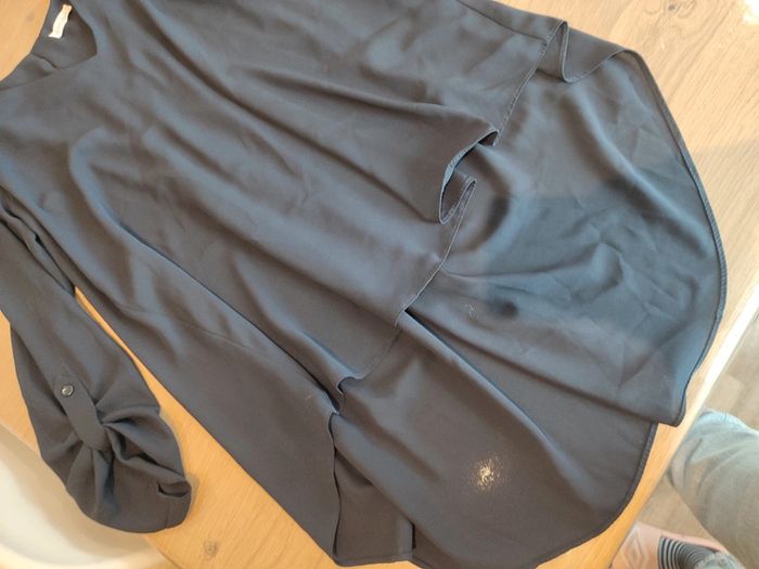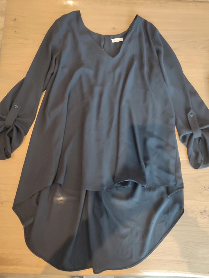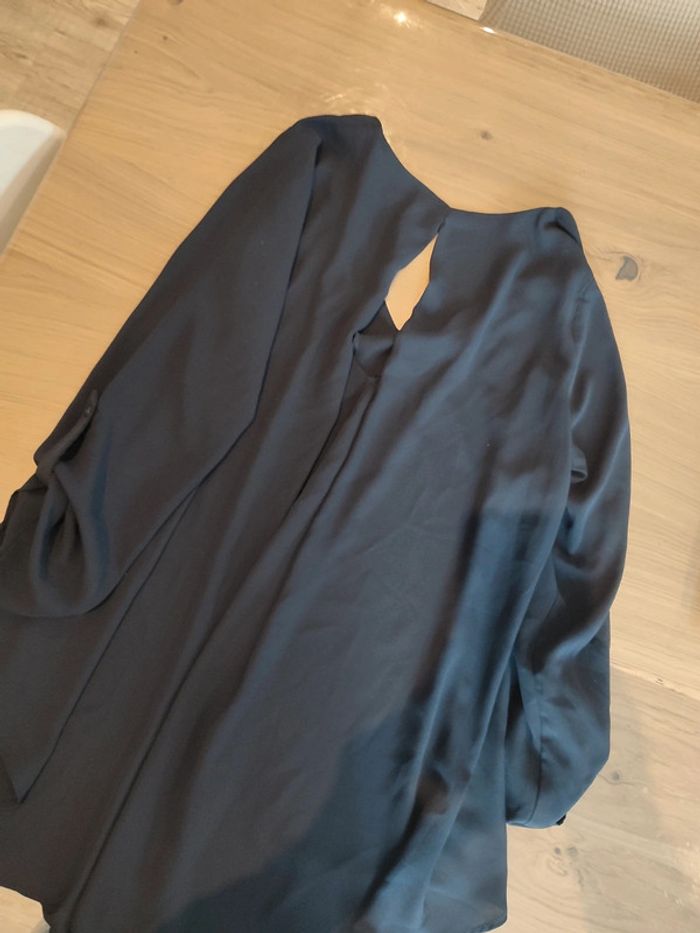 Blouse légère bleu marine. Longue à l'arrière. Manches 3/4. Achetée chez cache cache. Ouverture en haut du dos.