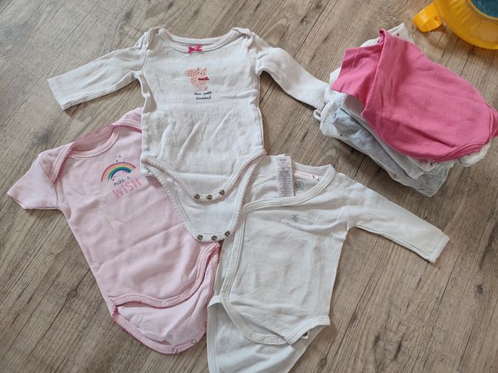 Gros lot de bodies filles en 3 mois. Il y a des manches longues et courtes. Ils sont en très bon état. Certains sont mixtes. De toutes marques : tape a l'oeil, Kiabi, pommette, gemo, petit bateau...
