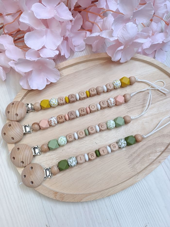Attache tétine personnalisée Bois naturel et Silicone alimentaire Sans BPA ni autres substances toxique Différents coloris possibles