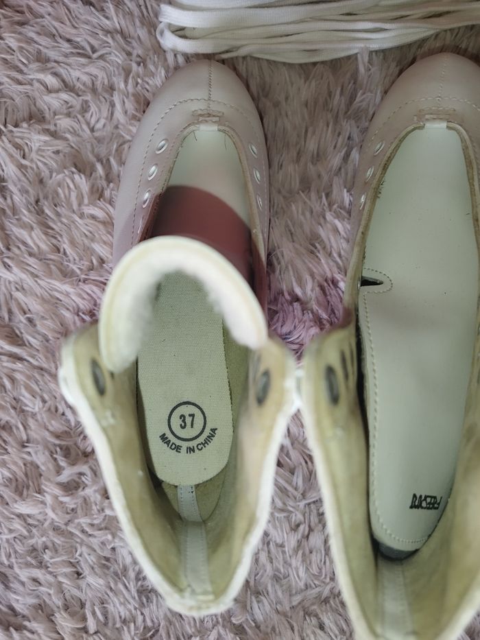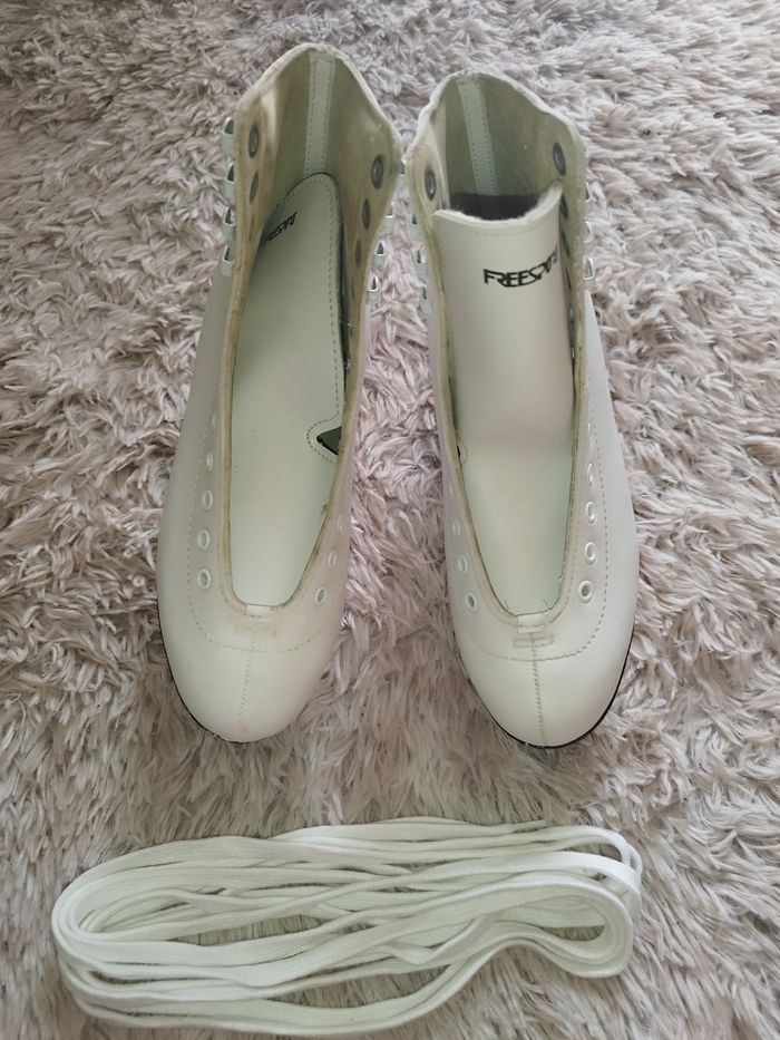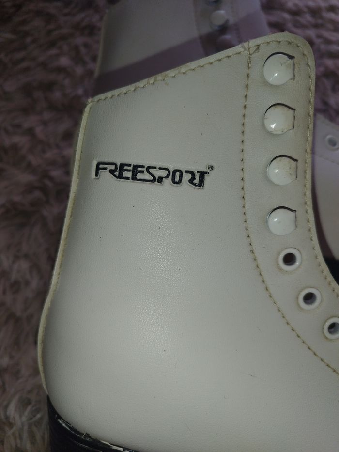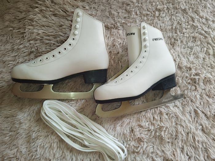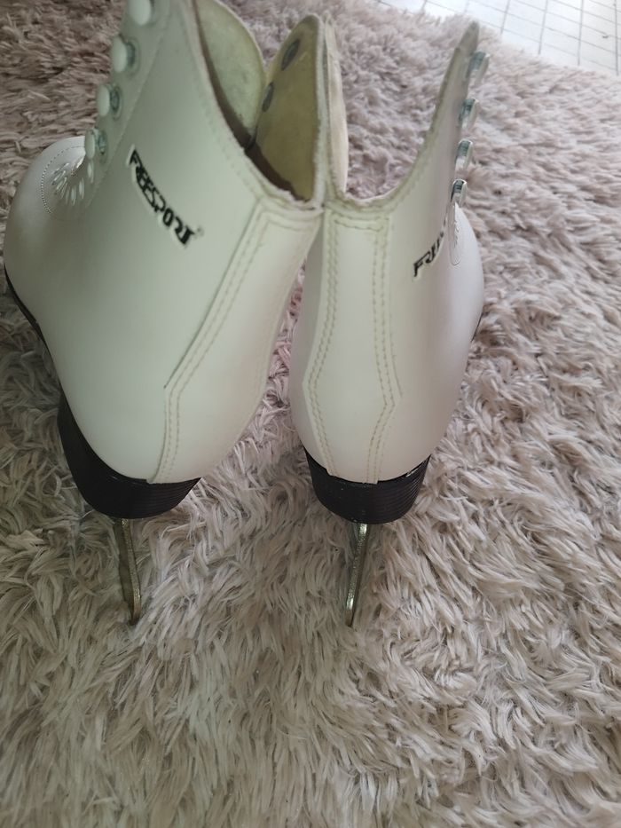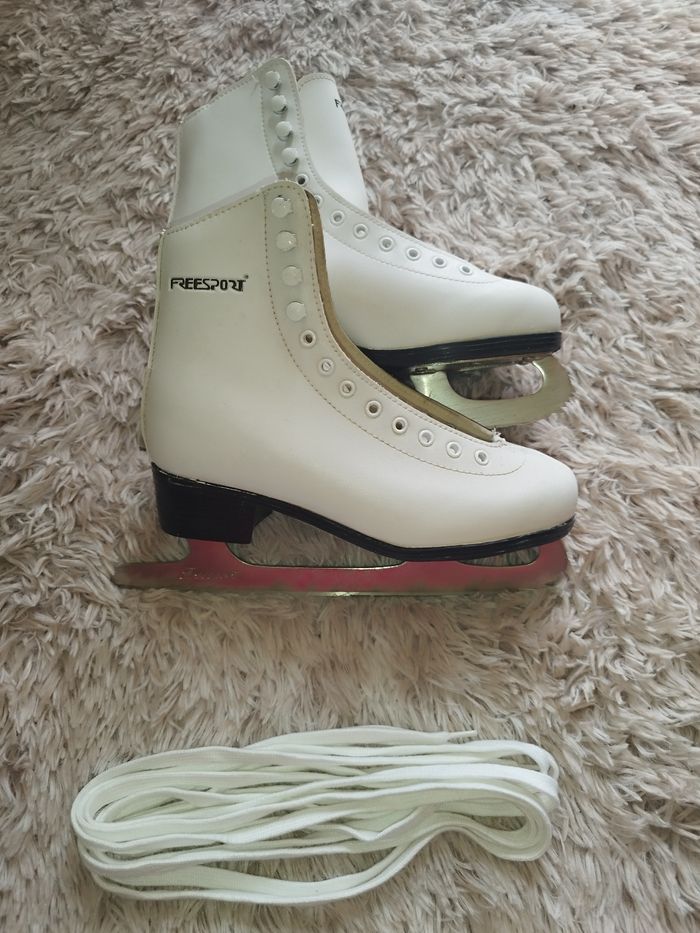 Patins à glace blanc pointure 37, acheté, jamais utilisé et stocké dans un garage. Un bon entretien sera à prévoir. Petite marque rose sur le bout d'un des patins dû au stockage . Très bon état général