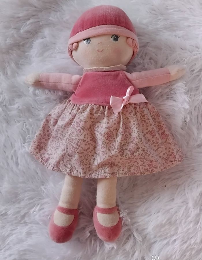 Doudou peluche poupée chiffon en tissu rembourré de couleurs blanc et rose Bonnet sur la tête en velours et en tissu de couleur rose Vêtu d une robe en velours de couleur rose et étoiles tissu fleuris Nœud en satin de couleur rose Poupée qui mesure 35 cm