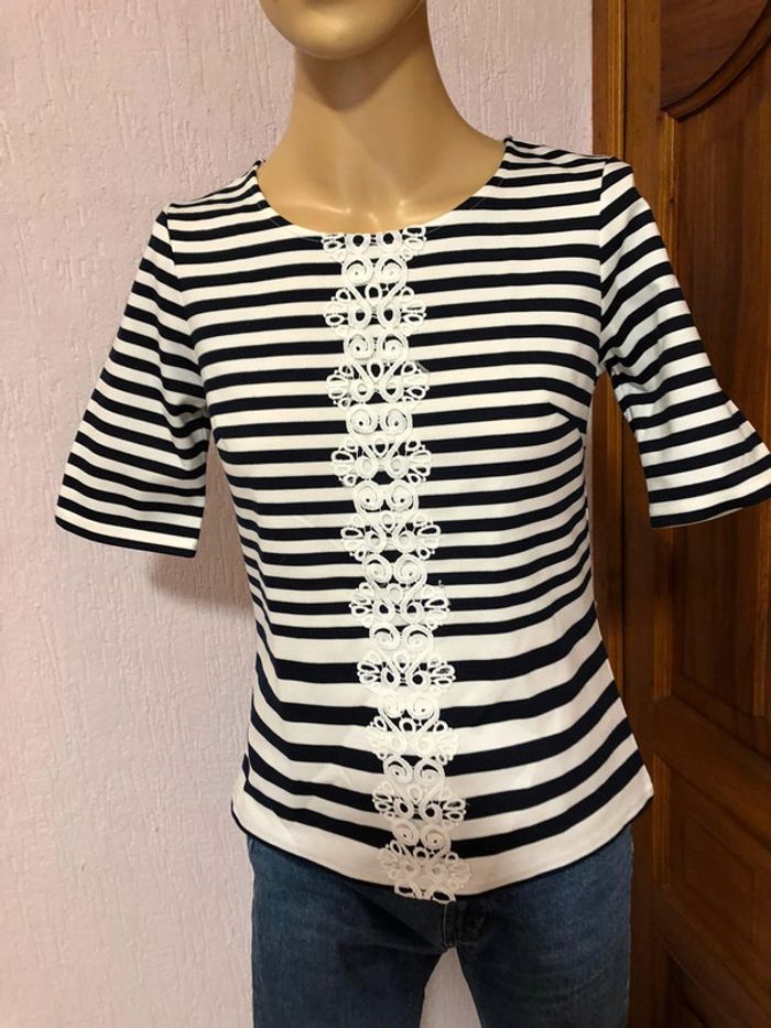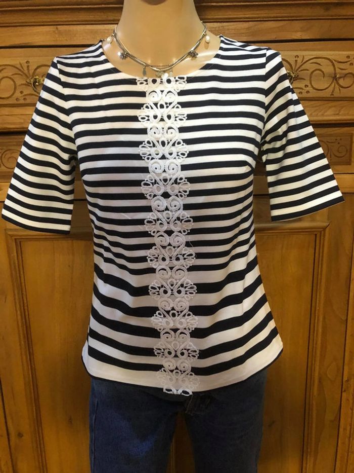 T-shirt marinère de la marque jus d'orange broderie à l'avant blanc et bleu marine Taille 2 (correspond à un 36/ petit 38) n e u f avec etique tte #Jusdorange #marinière