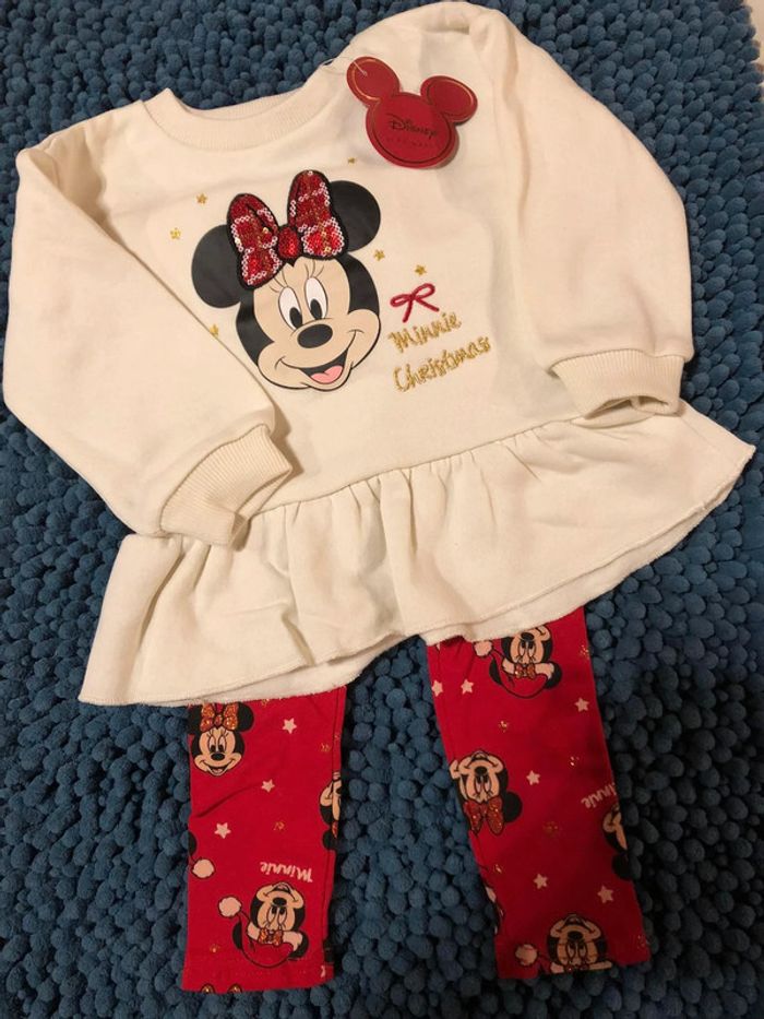 Ensemble comprenant un sweat (tunique) couleur crème et un leggings caleçon rouge avec Minnie pour Noël Taille 18/24 mois 92 cm Disney jamais porté n e u f