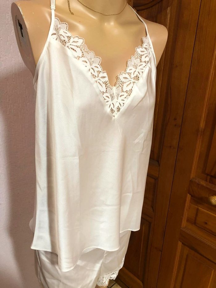 Ensemble de nuit top/ caraco / débardeur à bretelles et mini short avec dentelle Blanc Matière soyeuse, très sexy Etam lingerie Taille L jamais porté n e u f avec eti que tte (valeur 32,99€ et 25,99€ )