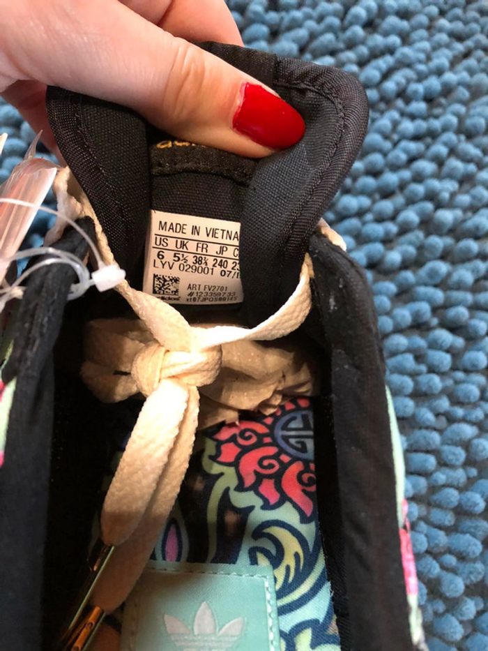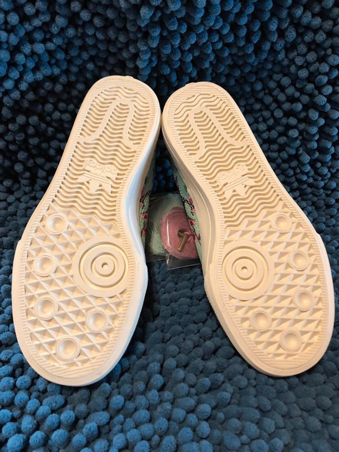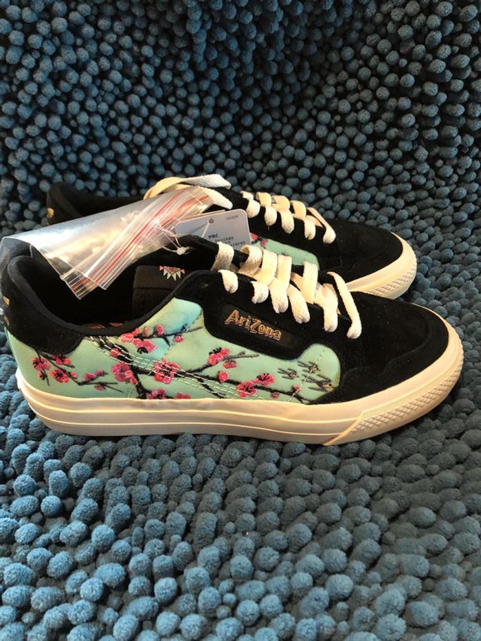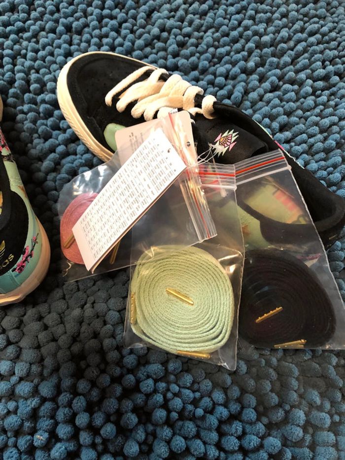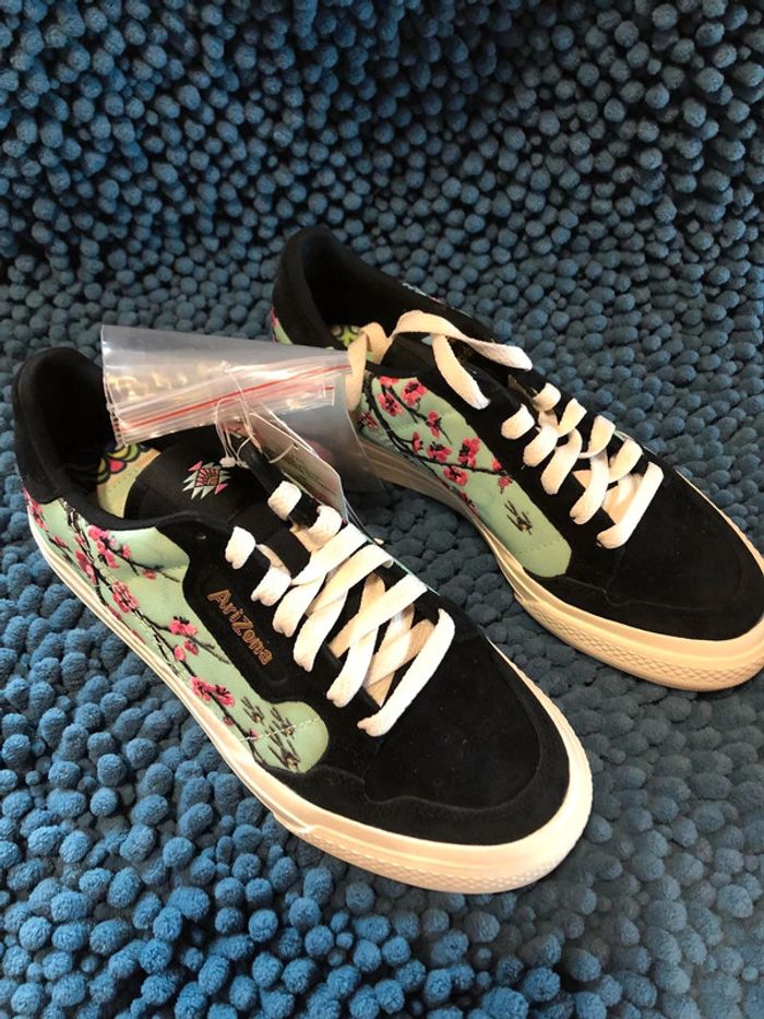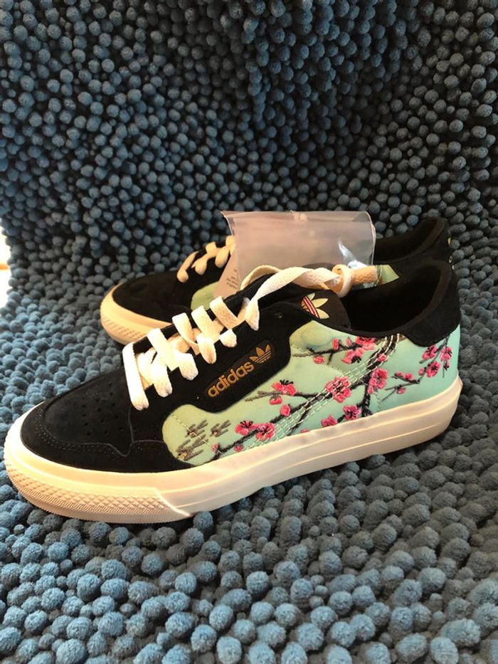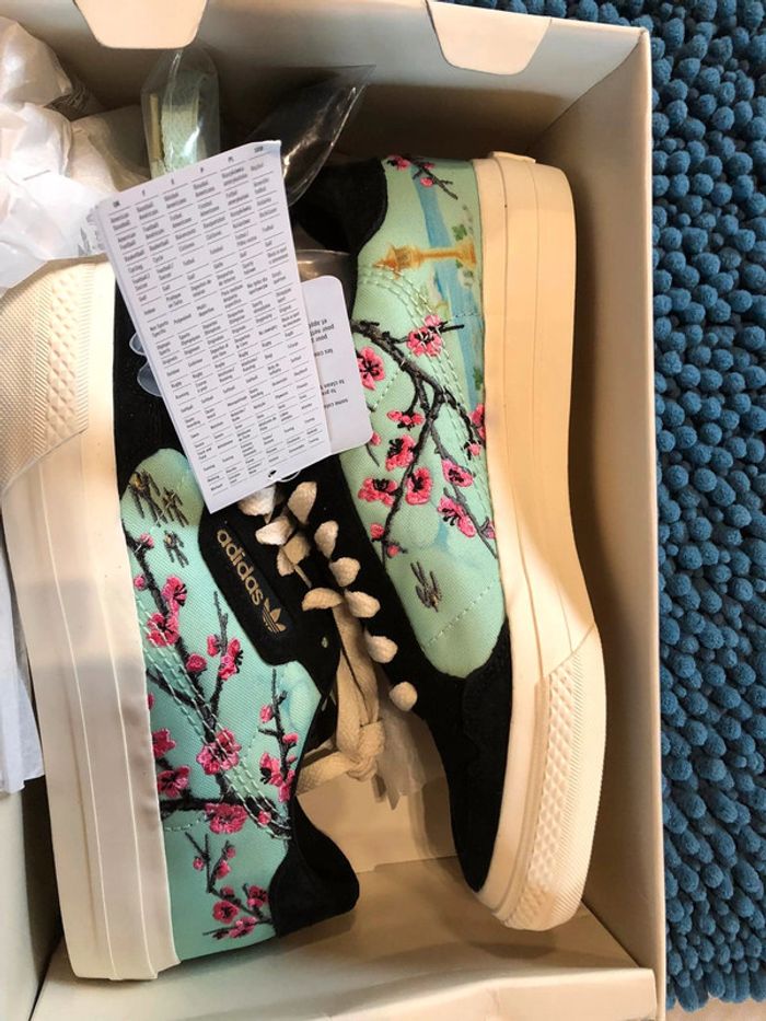 Paire de baskets adidas modèle continental 80 vulc x Arizona thé glacé iced tea green tea pointure 38 2/3 (US 6) 3 paires de lacets de rechange coloris noir et vert menthe / turquoise avec motifs branches et fleurs de cerisiers n e u v e s avec boite d'origine