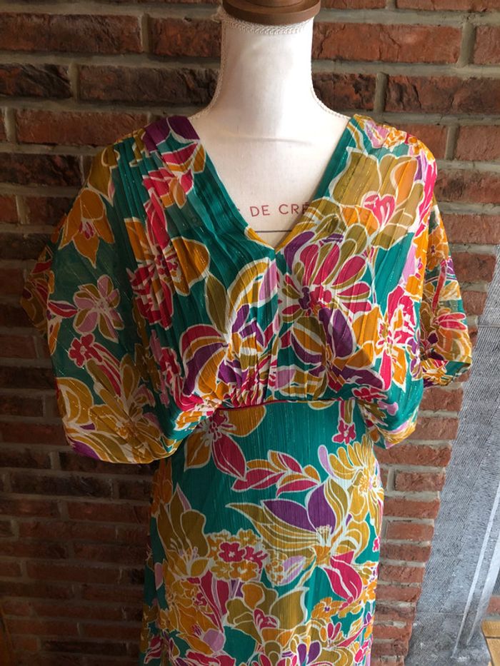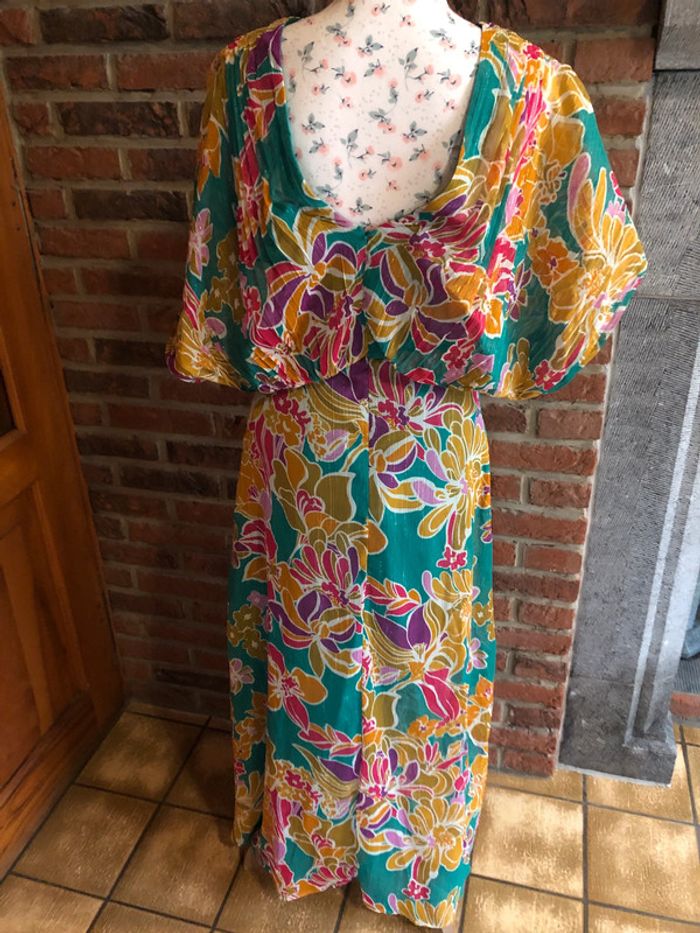 Très belle robe longue à fleurs 🌺 multicolore Naf naf Taille 36 Couleur vert, orange, ocre, violet et fil doré dans le motif Fermeture éclair au dos Possibilité de porter avec les manches volantes ou les replier Neuve avec étiquette (valeur 99,99€)