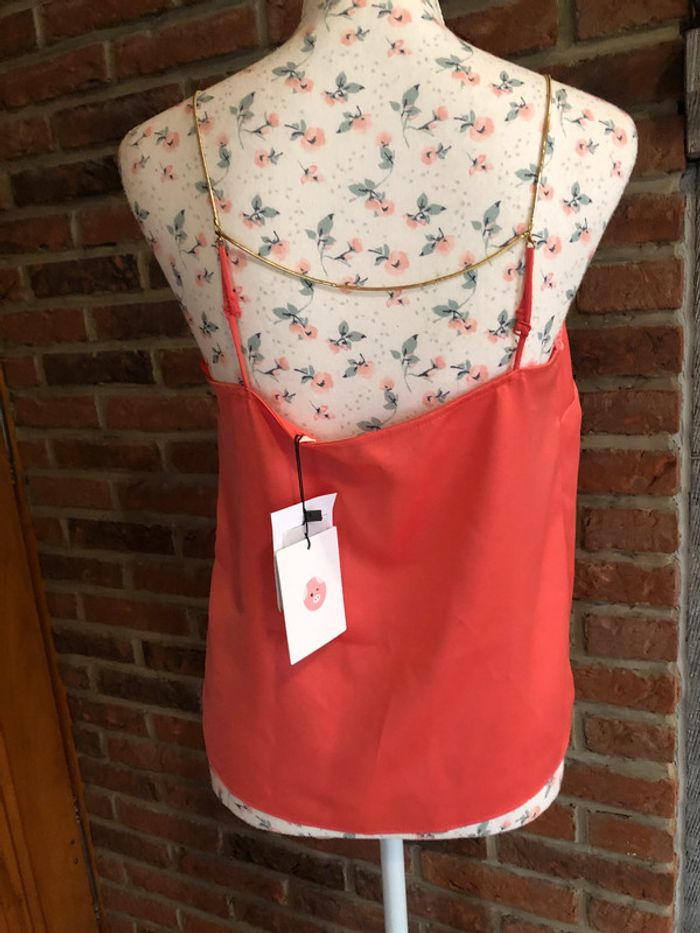 Top débardeur à bretelles naf naf Couleur corail et doré Dentelle au niveau du décolleté Bretelles dorées réglables et amovible pour le lavage Très chic, matière soyeuse Taille 38 N e u f avec étiquette