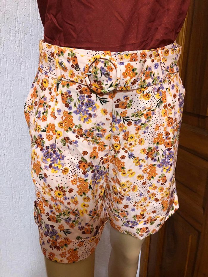 Short bermuda à fleurs naf naf tons rose pastel, orange, jaune, lavande et rouge brique Ceinture avec boucle Taille 38 Naf naf jamais porté, n e u f (valeur 44,99€) #short #Nafnaf #Mllenafnaf_nafnaf