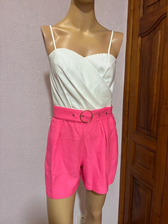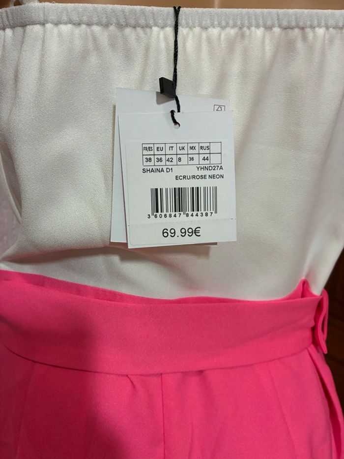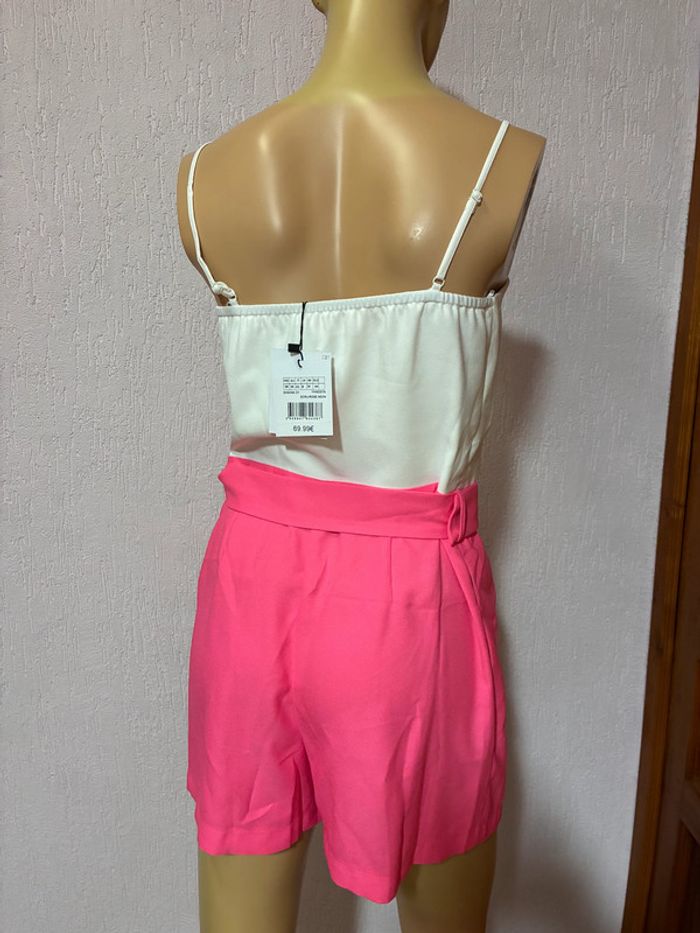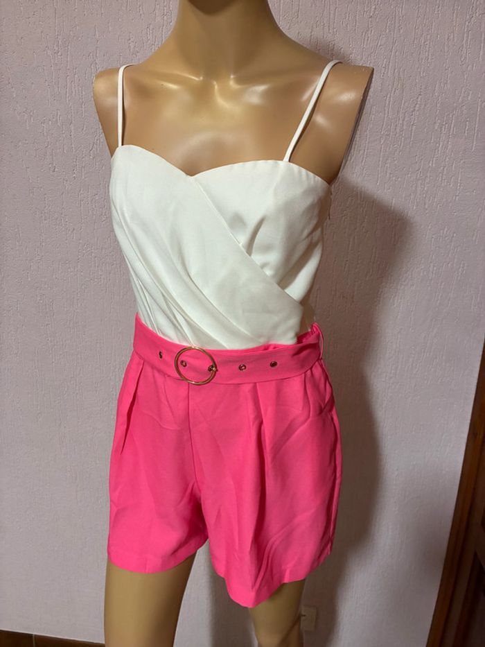 Combi short rose flash avec ceinture et haut blanc Bretelles amovibles, possible de le porter en version bustier Taille 38 Neuve jamais portée (valeur étiquette 69,99€)