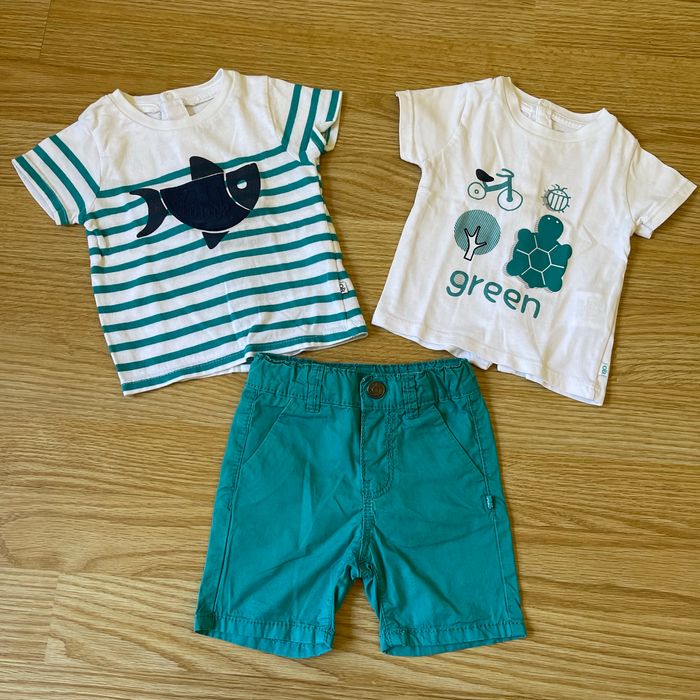 Short et tee shirt obaïbi . Très bon état . Taille 3 mois. Le short se serre à la taille et les tee shirt s’ouvrent entièrement au dos .