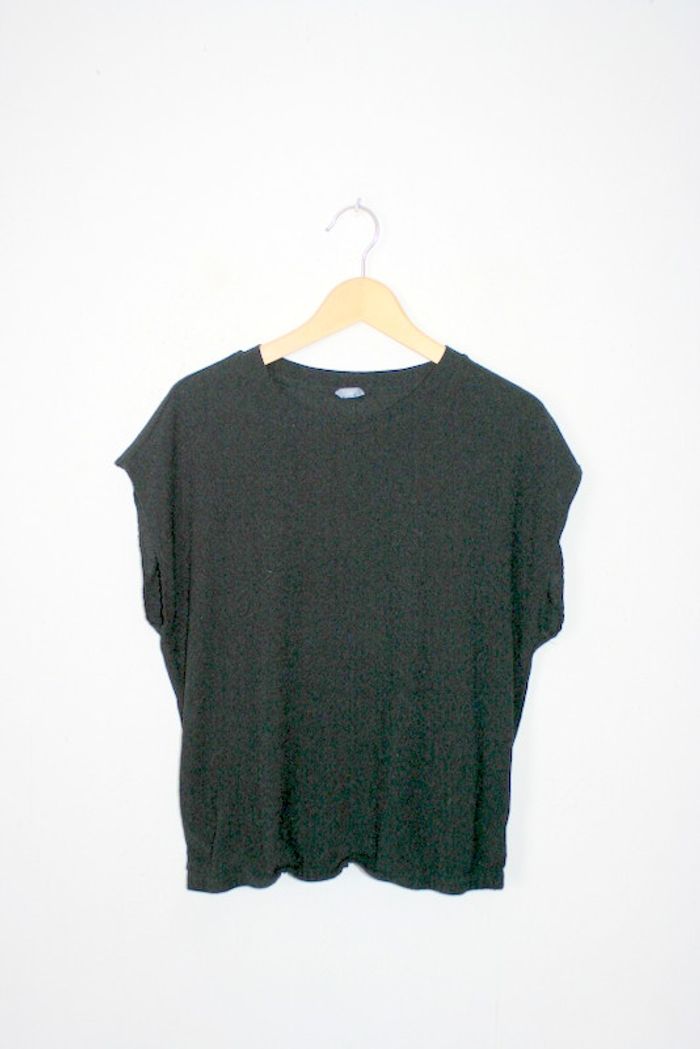 Haut noir Zeeman taille 46, porté 1 fois, élastiqué à la taille (l'élastique a peu vrillé au lavage), 59cm de long, 44cm d'épaule à épaule, 55cm d'aisselle à aisselle, 98% polyester / 2% élasthane, 140g