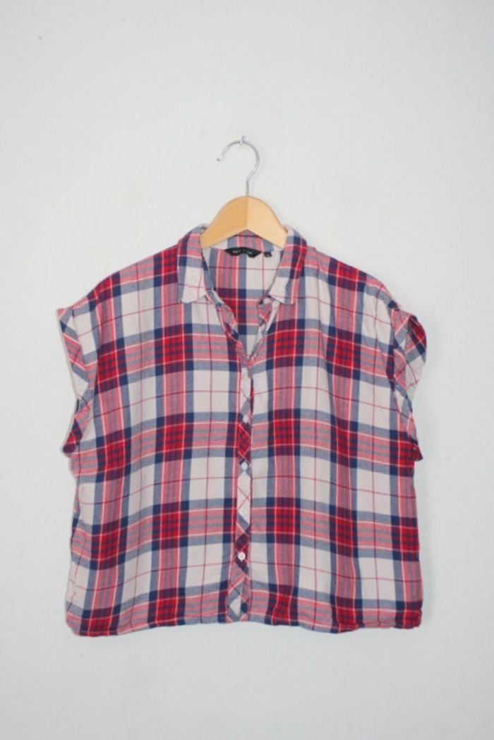 Chemise à carreaux courte de chez New Look, taille 18 (environ 46), 42cm d'épaule à épaule, 51cm de long, 58cm d'aisselle à aisselle, bouton de rechange à l'intérieur, 100% coton, un peu pelucheuse par le lavage, 130g