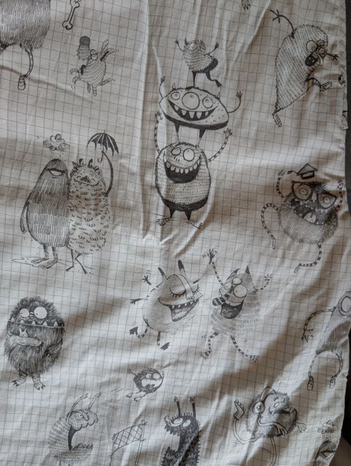 Motif d'une feuille de quadrillage rempli de dessin de mignons petits monstres en noir et blanc comme certains gribouillage.