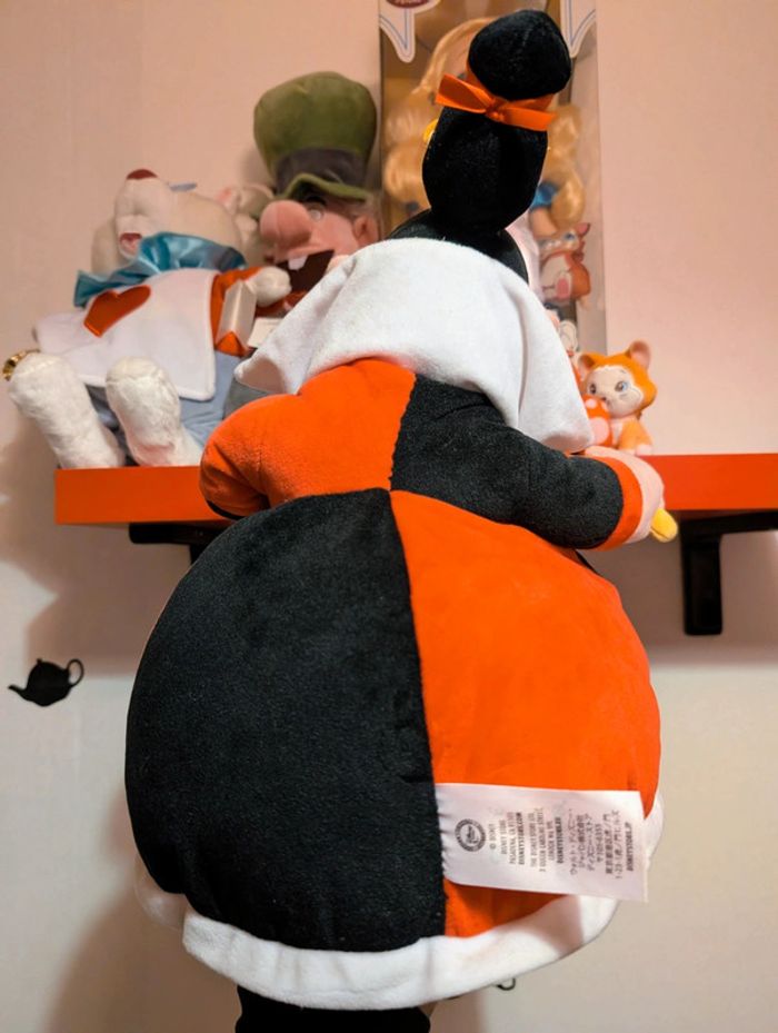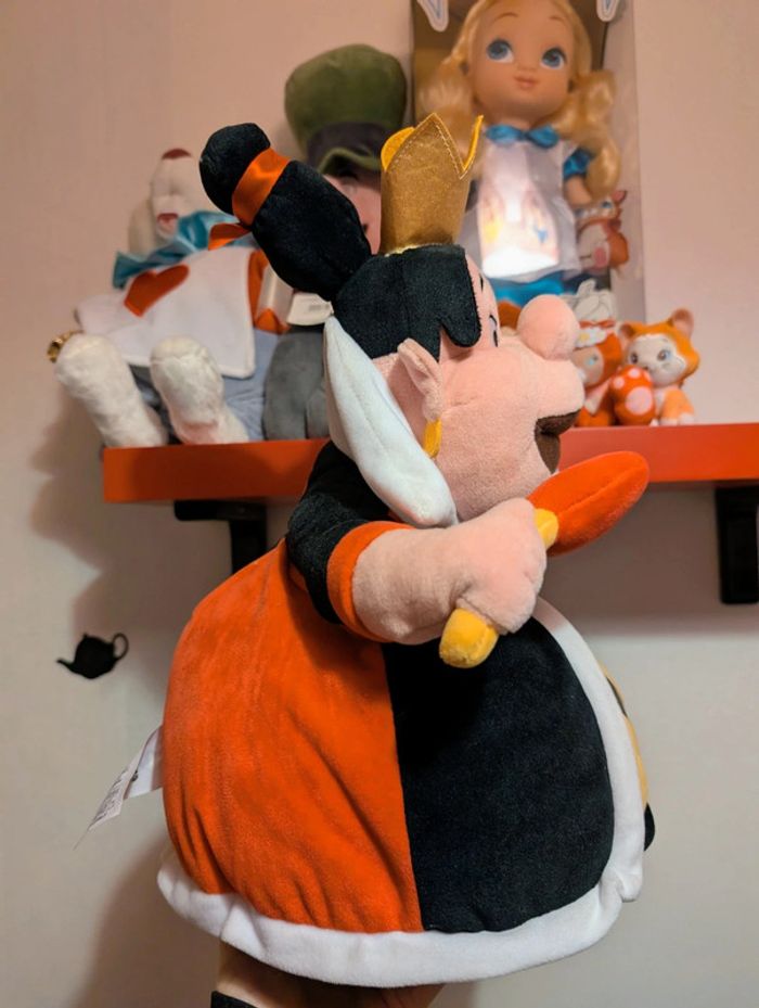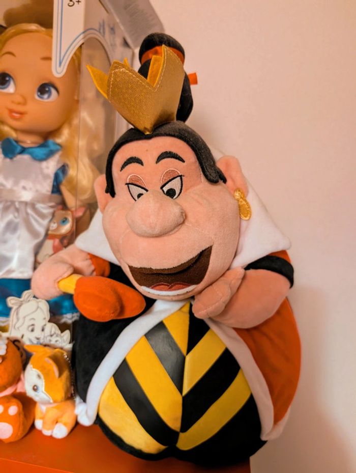 Ne perdez pas la tête ! Câlinez la reine pour éviter de la mettre en colère. Produit inspiré d'Alice au Pays des Merveilles (1951) Peluche personnage Tenue classique Broderies Fini molletonné Produit créé pour Disney Store Macaron sous la robe Environ 30cm environ En parfait état, comme neuve juste exposée sur une étagère.