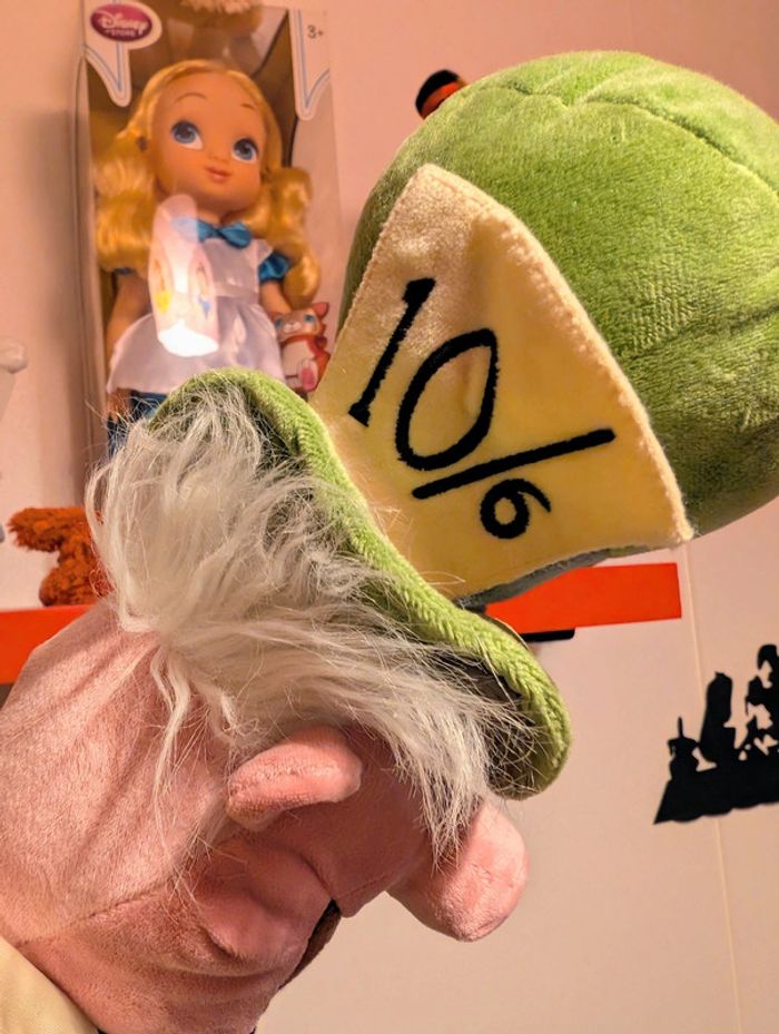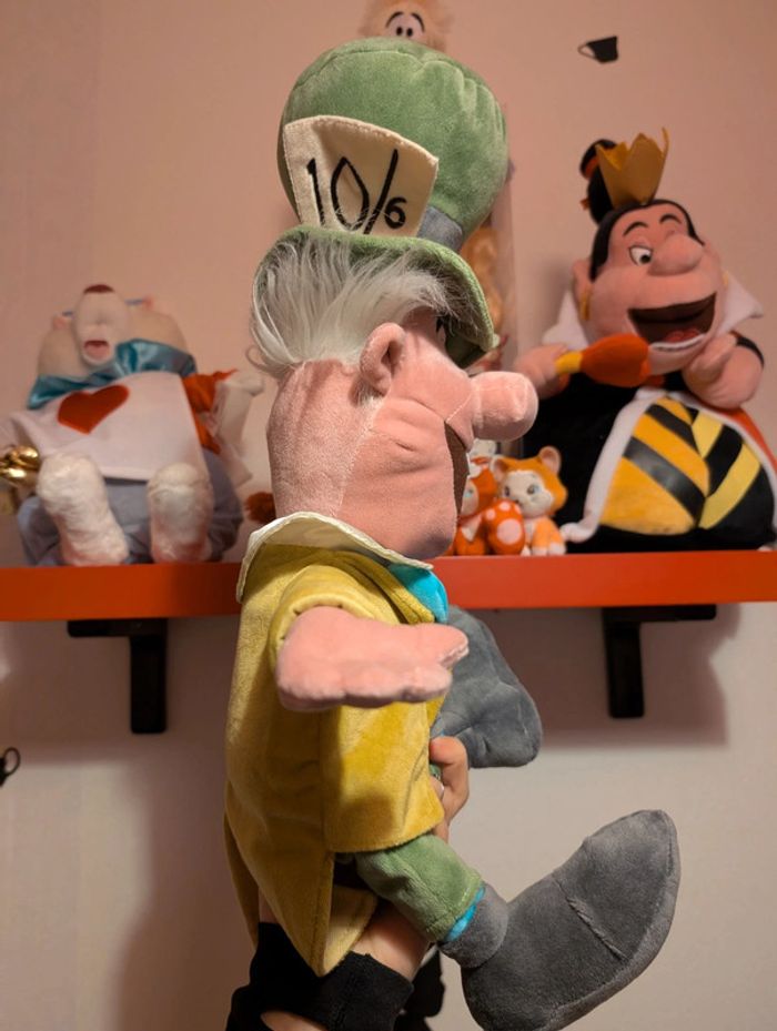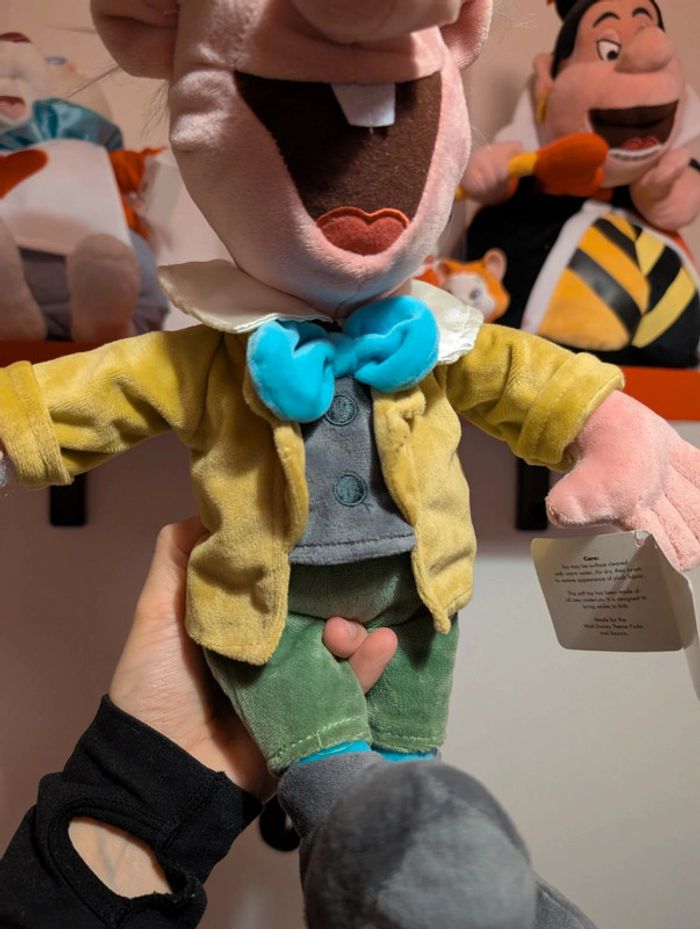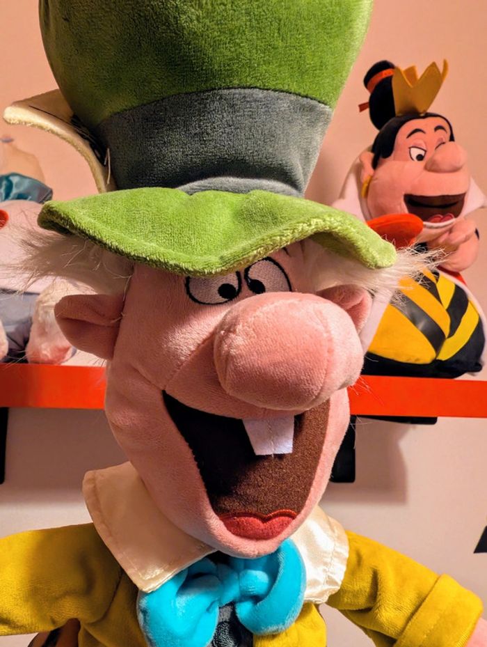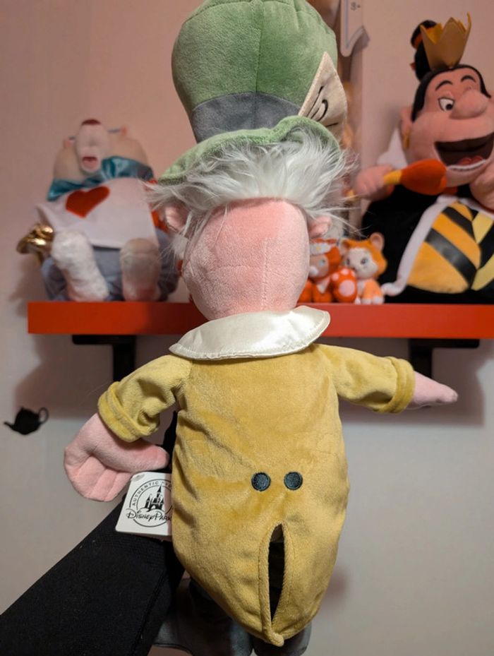 Peluche Le Chapelier fou DISNEY STORE Alice au Pays des Merveilles Le Chapelier Fou est le compagnon du Lièvre de Mars qu'Alice rencontre au cours de ses aventures. Produit inspiré d'Alice au Pays des Merveilles (1951) Peluche personnage Tenue classique, costume 3 pièces à la queue de pie Broderies Carte en feutrine sur le chapeau Fini molletonné Produit créé pour Disney Store Couleur : vert, jaune, rose, bleu... Taille : environ 50 cm Disney Store écusson sous pied neuf avec étiquette Ancienne version, import USA