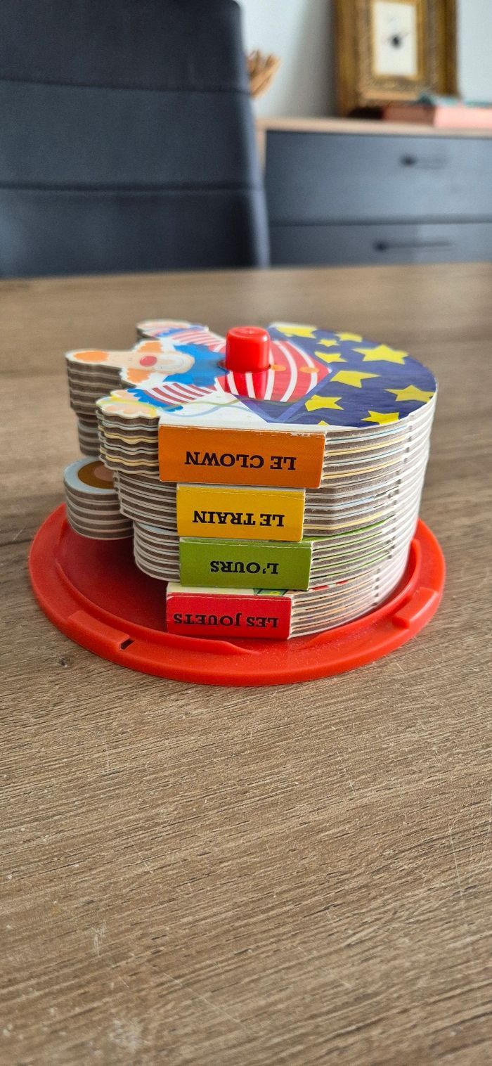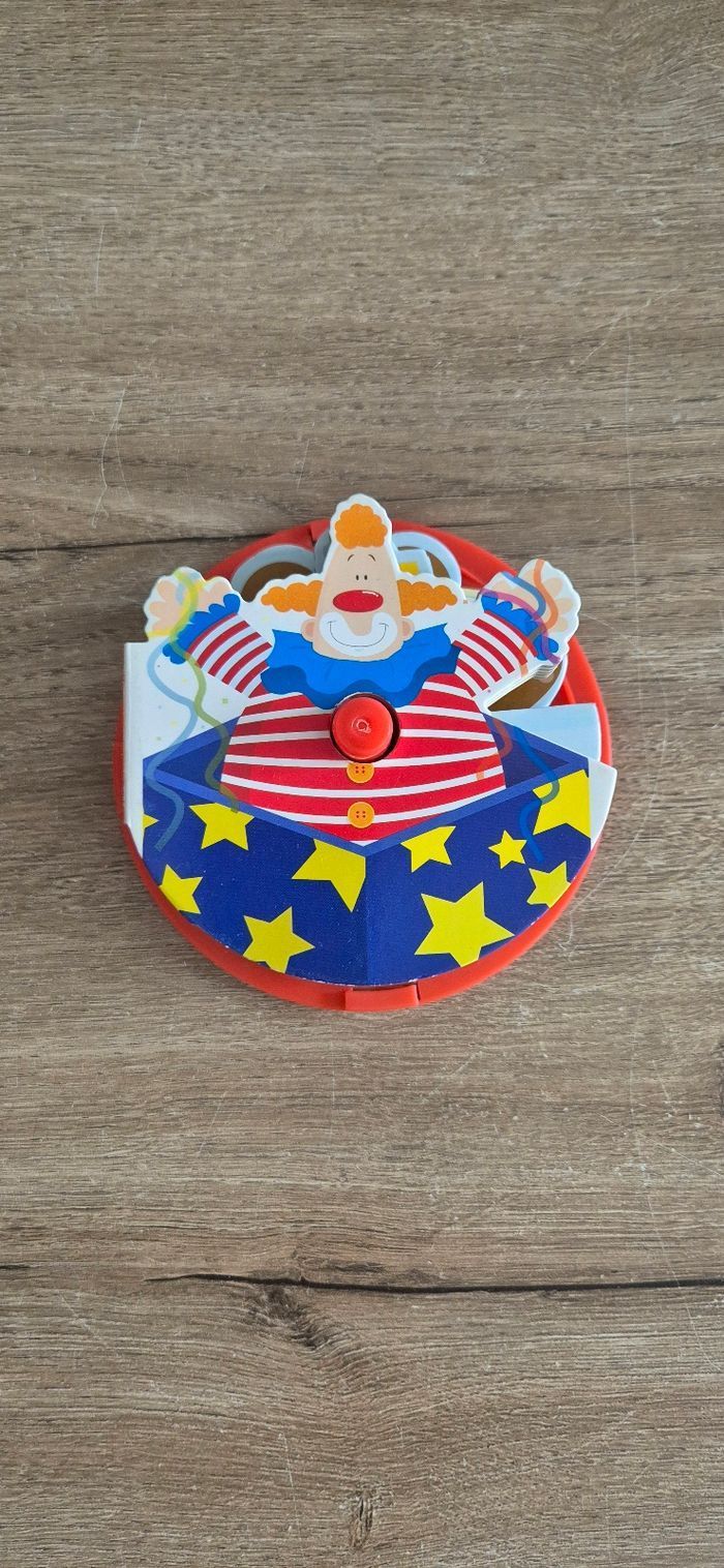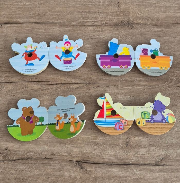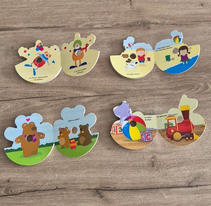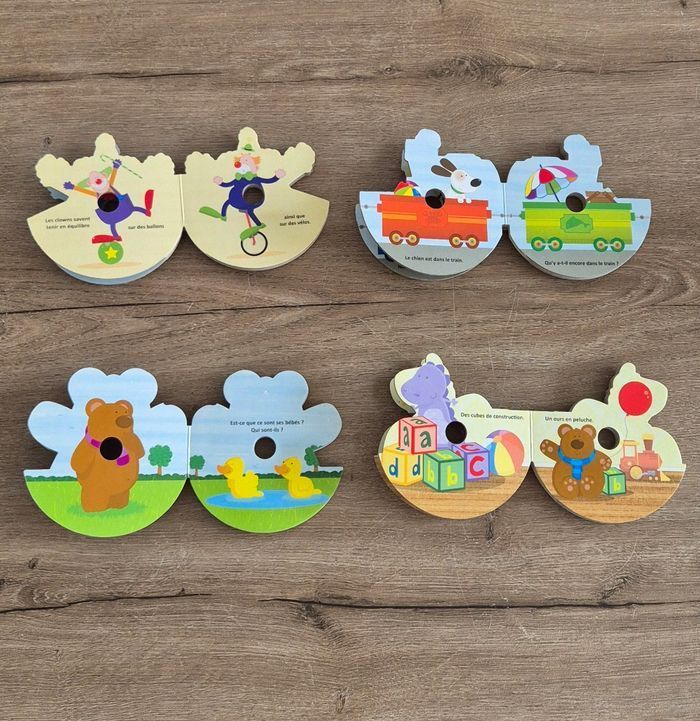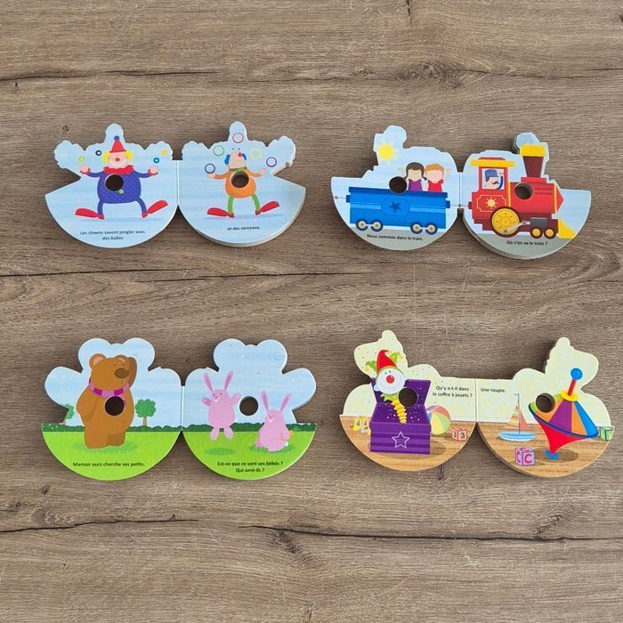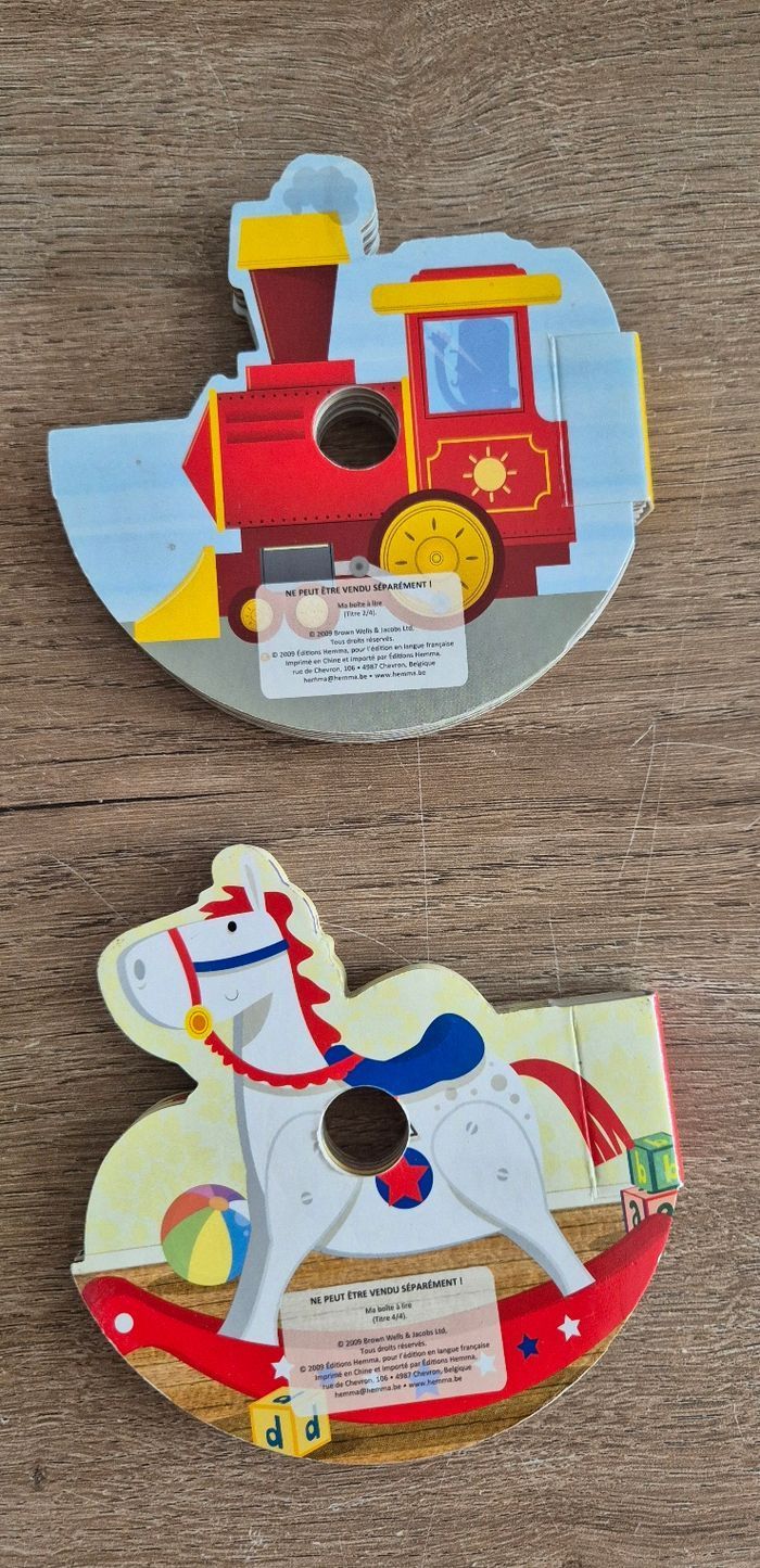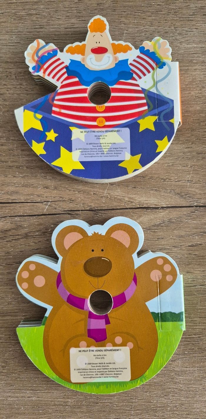 Ma boîte à lire original incluant 4 petits livres en carton empilés les uns sur les autres dans une boîte CD Une histoire de clown, de train, d'ourson et d'un soldat de plomb Éditions Hemma Bon état